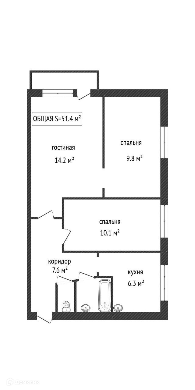 Общая площадь 51.4 м2