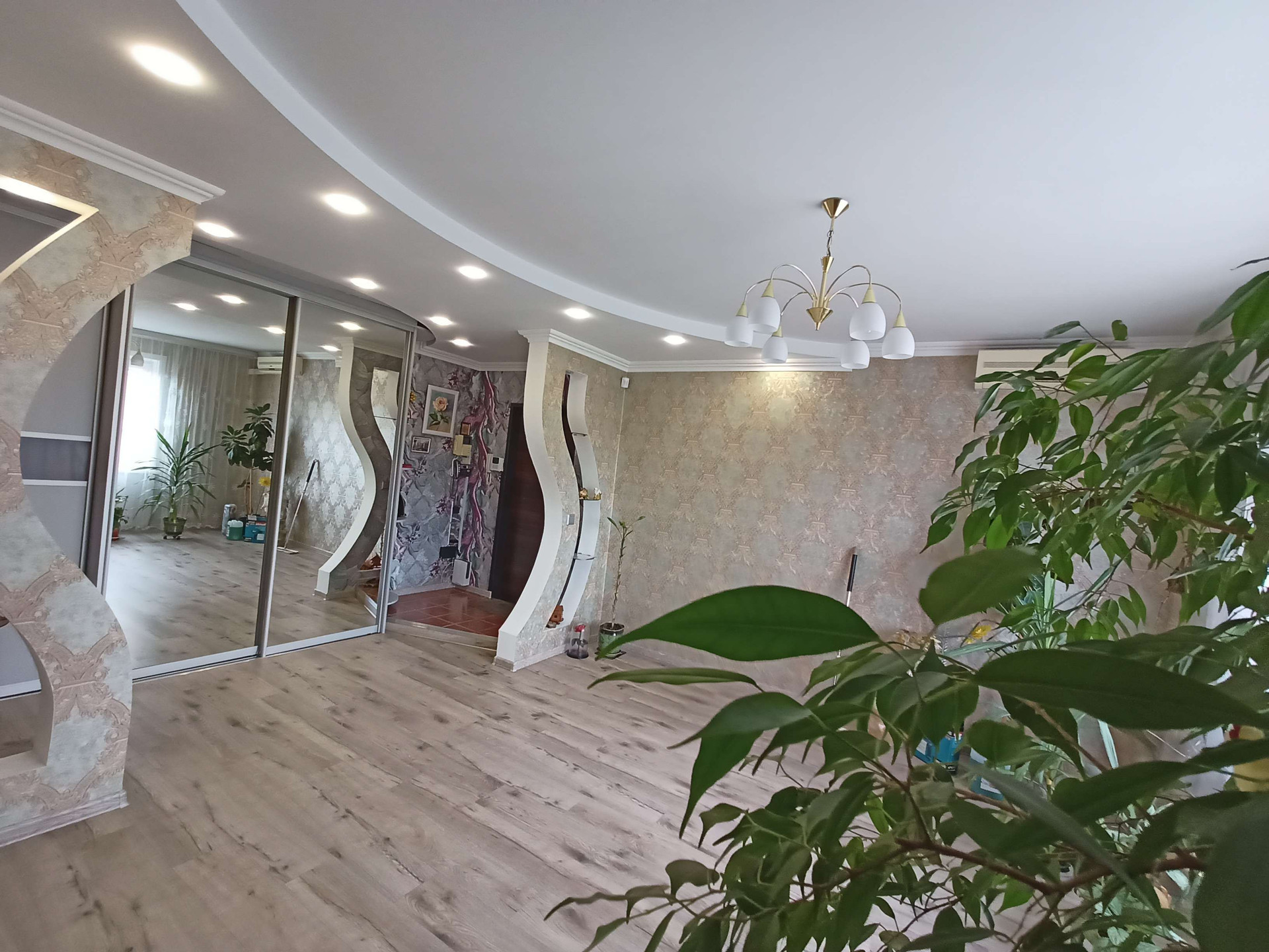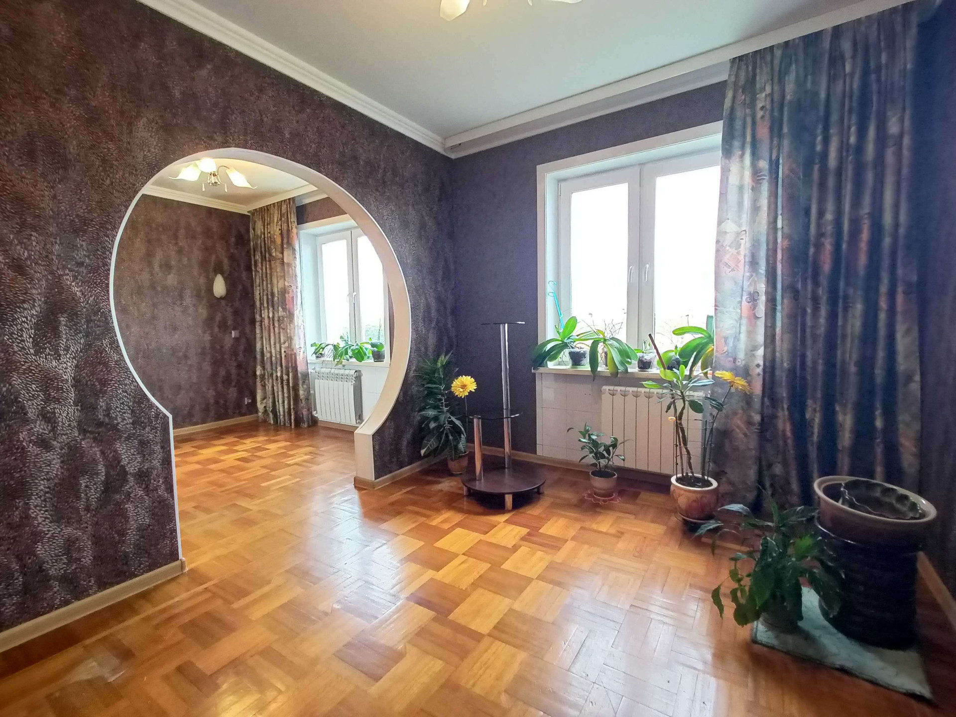 дизайнерские потолки, на полу качественный ламинат, паркет, пластиковые окна. Заменены: проводка на медную, отопительная, канализационная и водопроводная системы. Стены и полы выровнены. В ванной и туалетной комнатах, а также на кухне выложена качественная кафельная плитка. Надёжная входная дверь, установлена сигнализация.