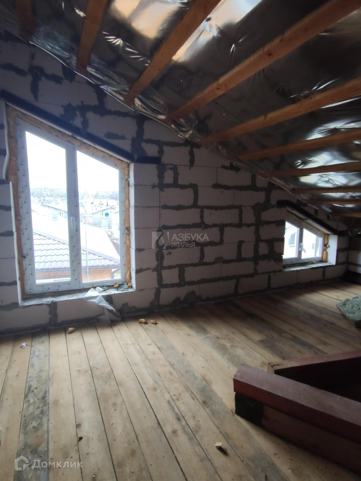 Дом из пеноблоков, деревянные перекрытия двух этажей. Стеклопакеты. Полы утеплены мин ватой и подшиты доской. Мягкая черепица. 2 и 3 этаж под свободную планировку.