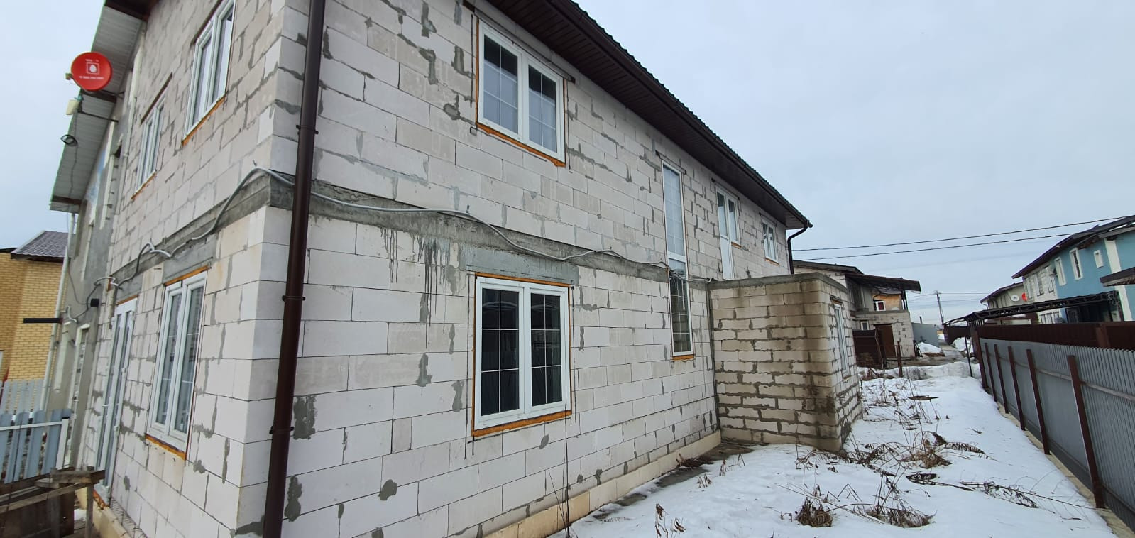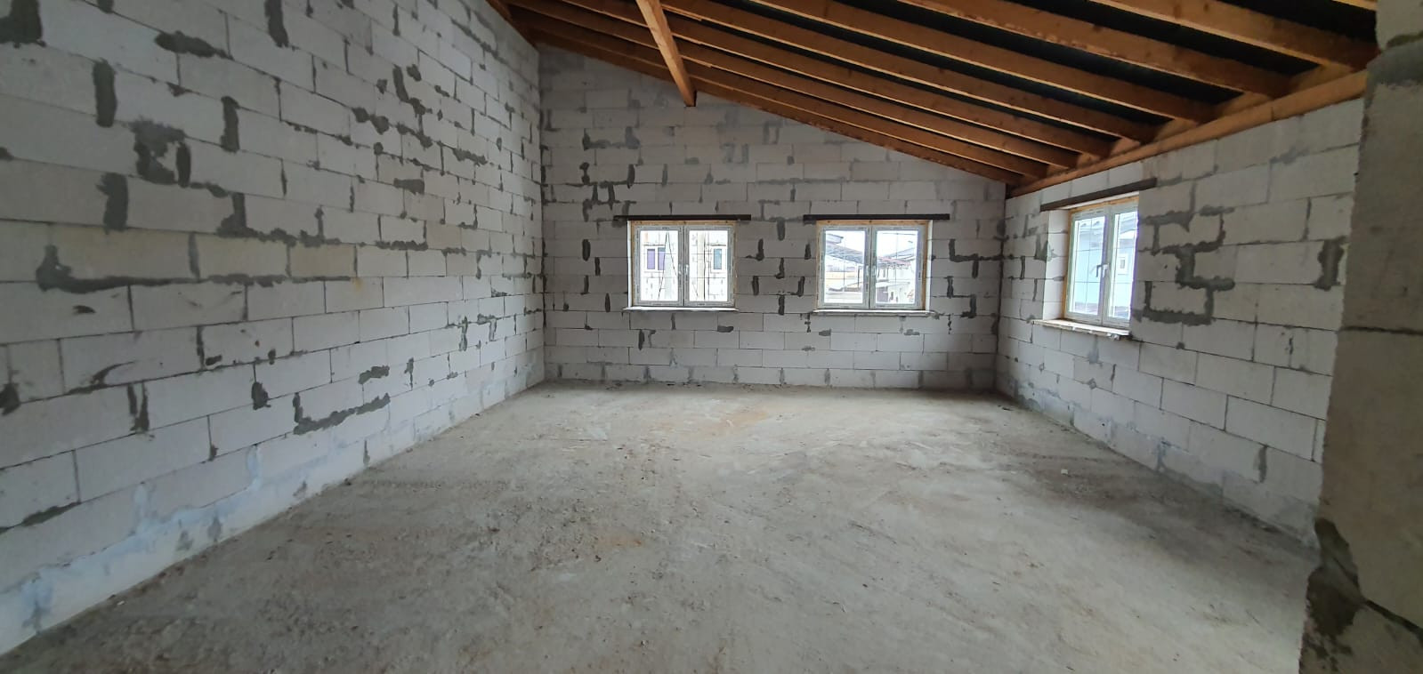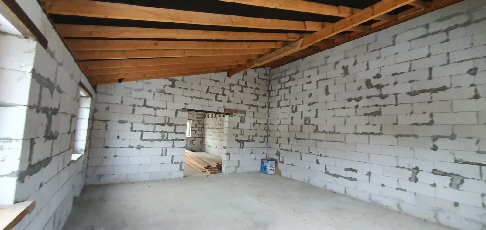 Дом построен из качественного пеноблока (строили для себя). Материал стен - кирпич, пенобетон, перекрытия - ж/б плиты, бетонный фундамент, вокруг отмостка и дома дренаж. Планировка: первый этаж два помещения по 50 м2 можно сделать гостиную и спальню. Второй этаж два больших помещения, можно сделать 3-4 спальни.