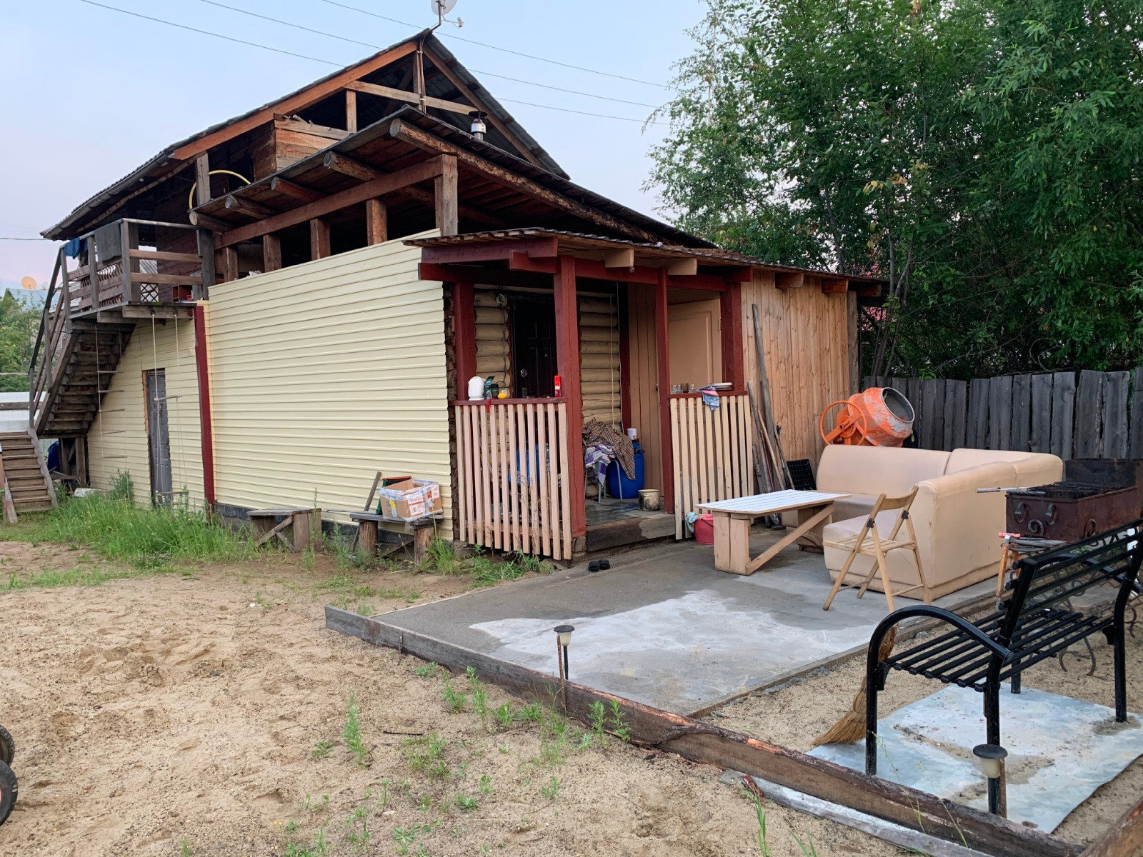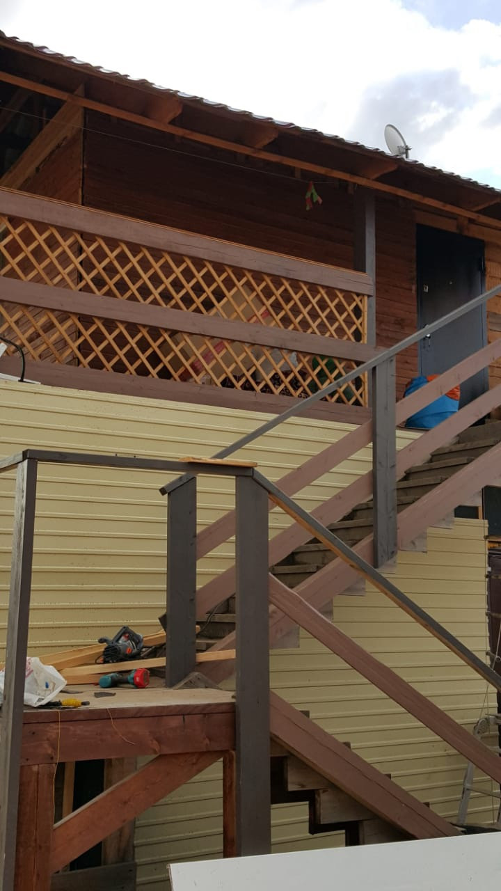 На территории имеется строение 6*6 в два этажа с большей лоджией с двух сторон 2 этажа, и пристроена к нему баня из кругляка, кладовка, на крыше бани можно сделать террасу и загорать. Первый этаж каменный, второй брусовой, окног пластик, металлическая входная дверь, 1 и 2 этажи входа отдельные, но можно объединить.