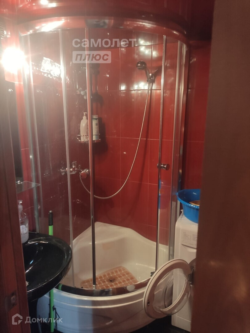-в ванной плитка и установлена душевая кабина,