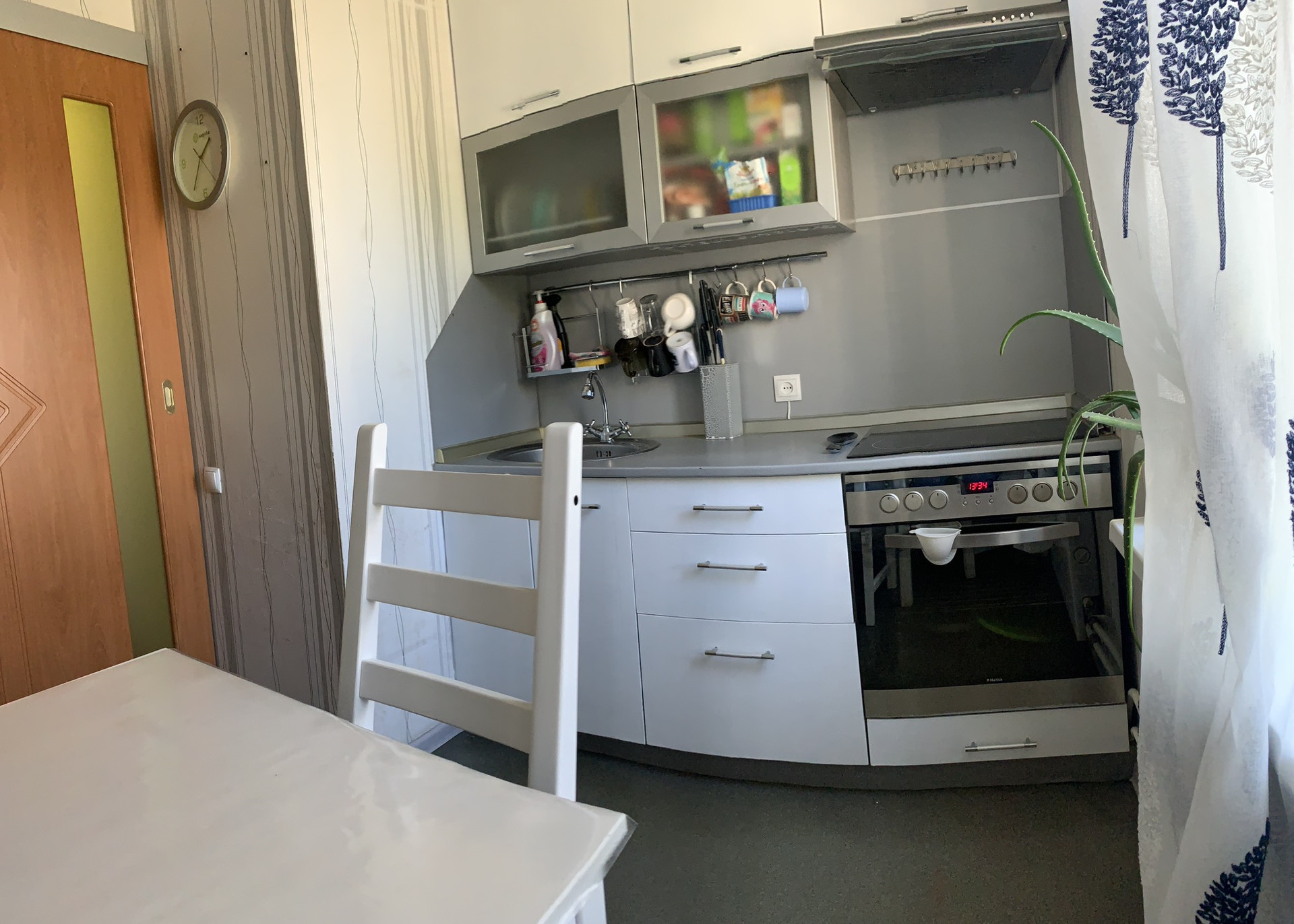 В квартире остаётся кухонный гарнитур с плитой и вытяжкой.