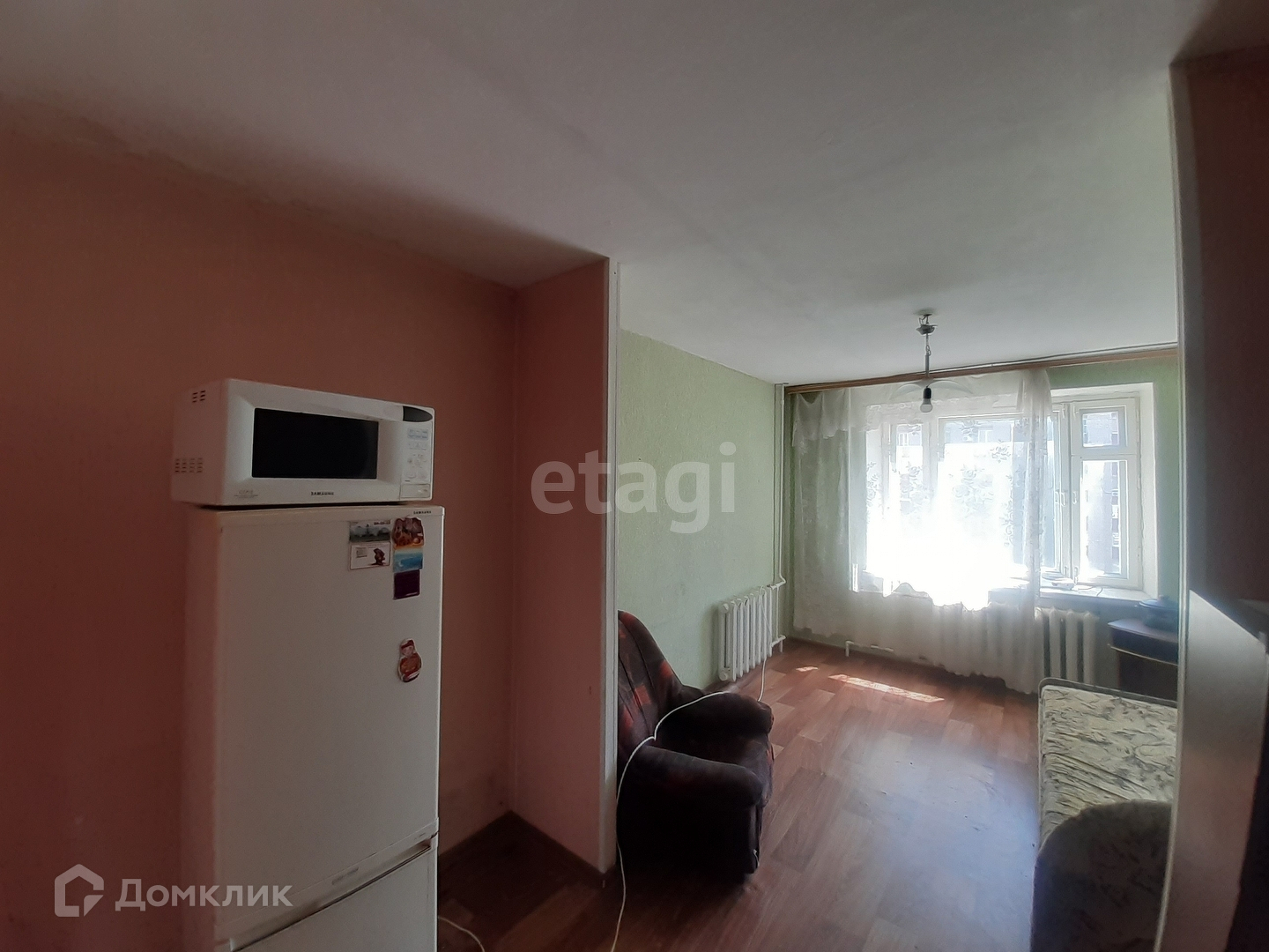 В комнате деревянное окно, но плотное, на полу линолеум. Комната не угловая, тёплая, окно выходит во двор, поэтому шума дорог не слышно совсем. Остаётся шкаф-прихожая.