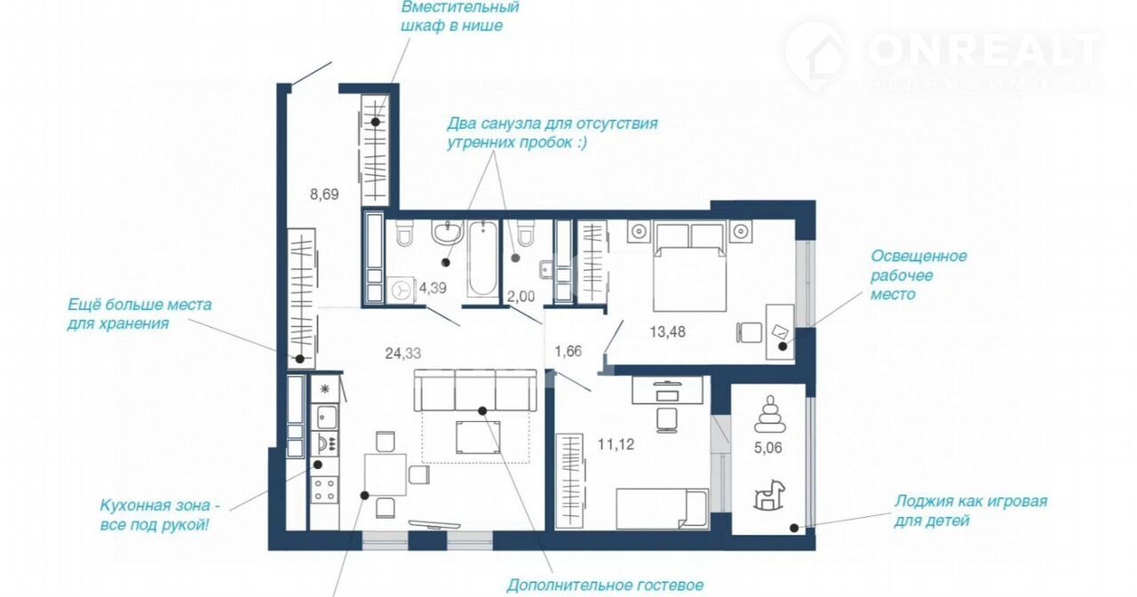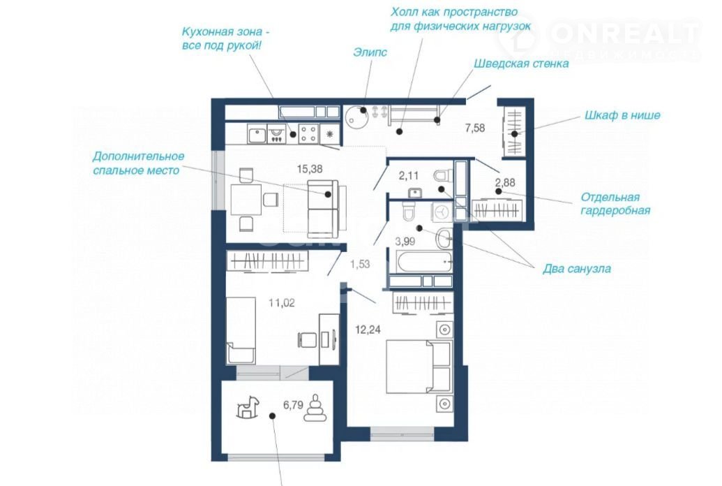 Жилая площадь 23.3 м2
