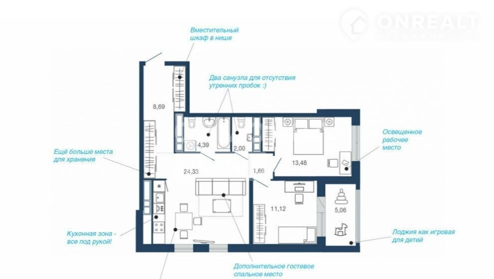 Новый проект ориентирован на максимально комфортное проживание современной семьи и предлагает 13 готовых для жизни планировок различных конфигураций: от небольших, функциональных студий до просторных квартир с тремя спальнями.