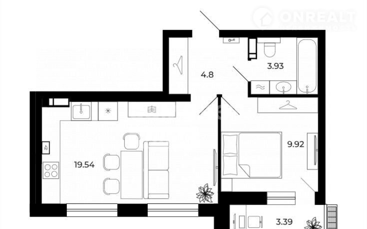 Планировка: комната изолирована - 9.92 м² с выходом на лоджию 3,39 м², просторная кухня-гостиная - 19.54м² , совмещенный санузел 3.93 м², коридор 4.8м².