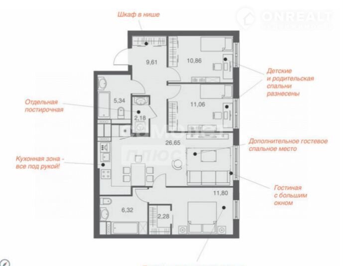 Трехкомнатная квартира площадью 86.1 м на 3 этаже. просторная кухня-гостиная 26,65 м, изолированные комнаты по 11.8, 11.06 и 10,86 м, одна из которых - мастер спальня со своим санузлом и гардеробной, просторный коридор 9.61 м, отдельная постирочная. черновая отделка.