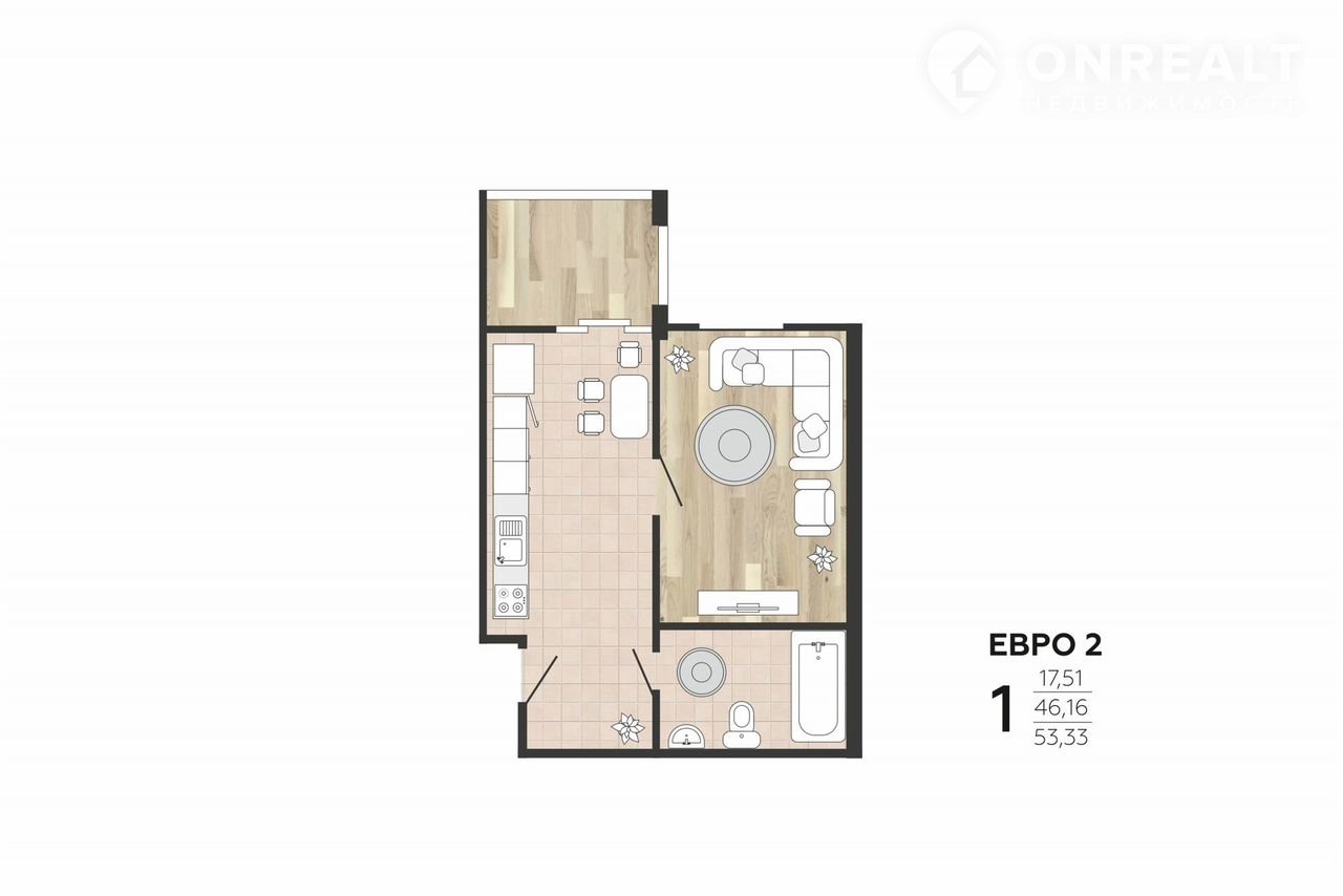 - oбщая площaдь 53,33 м² — бoльшe, чeм cтандартнaя «однушка»