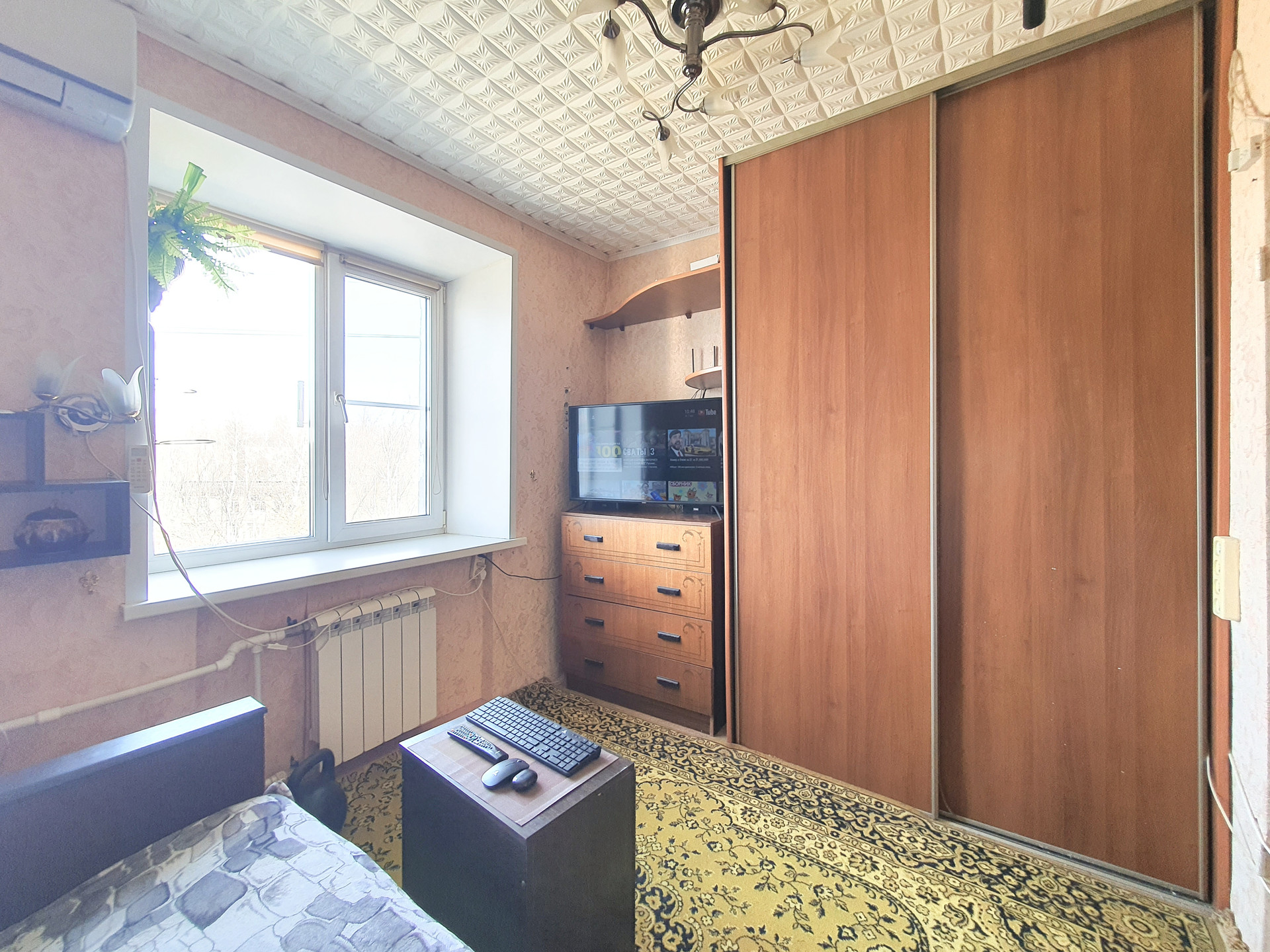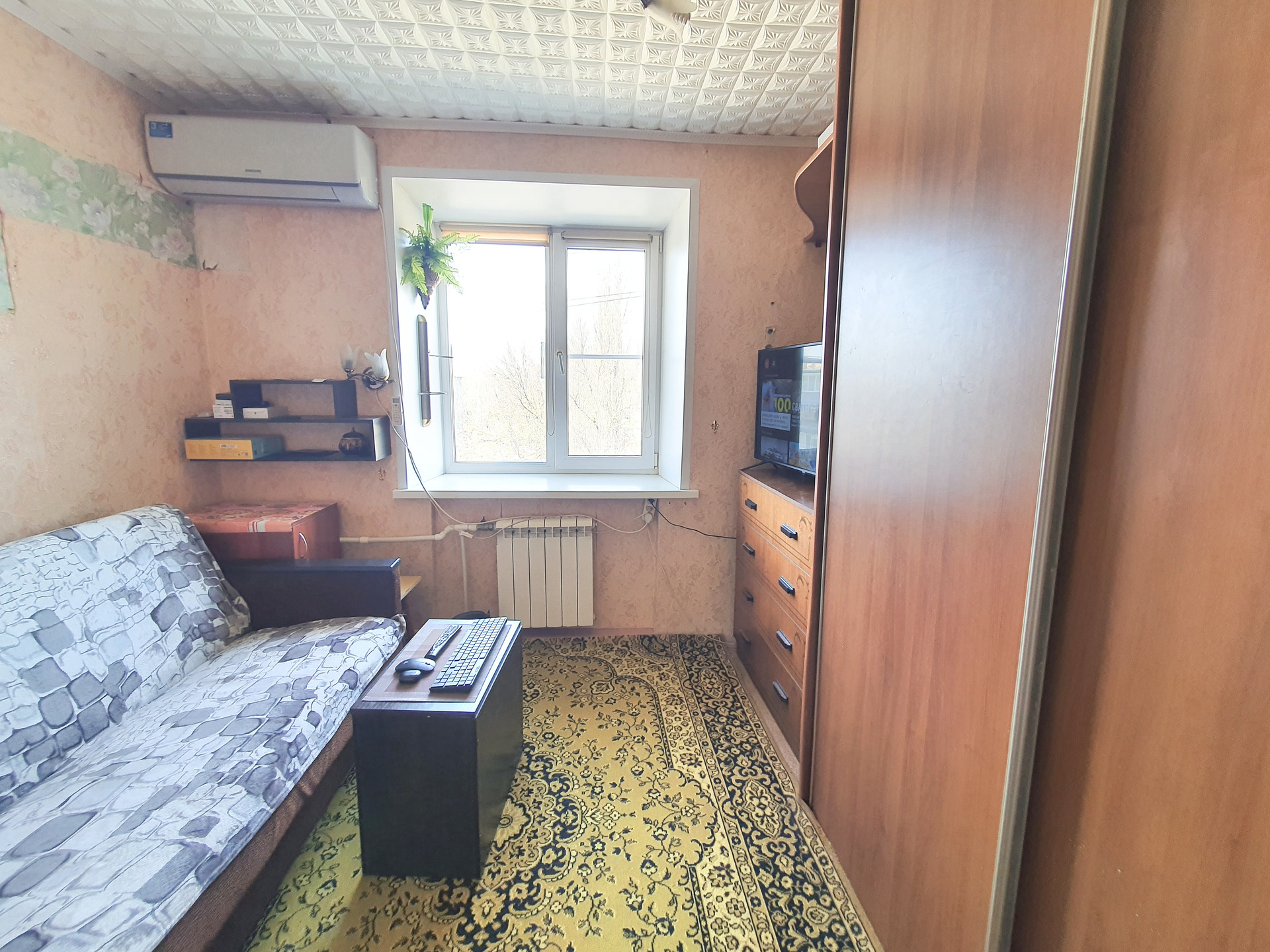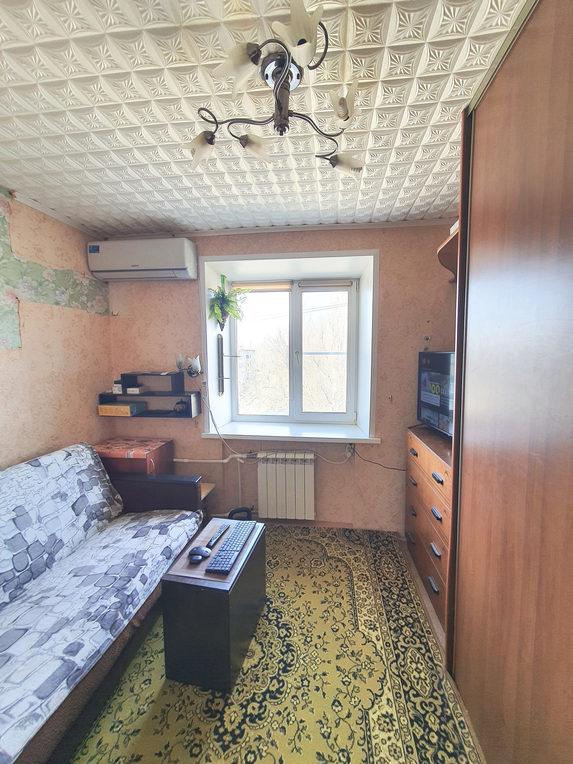 Продаю молодожёнку. Состояние обычное, установлено пластиковое окно, металлическая входная дверь, кондиционер. Удобства в комнате.