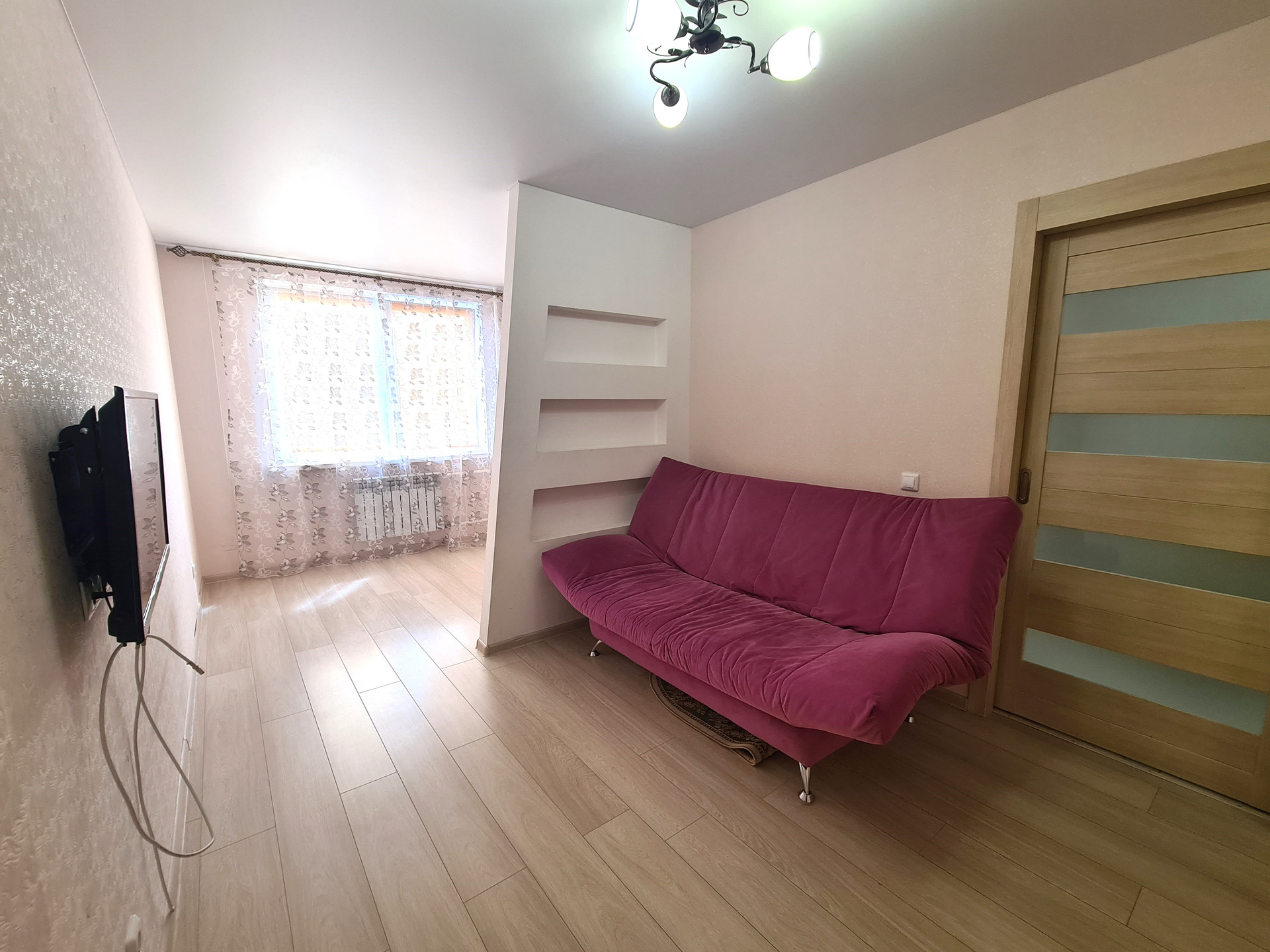 В квартире сделан хороши ремонт: окна ПВХ, на полу, комната - ламинат, с\у, коридор, балкон - плитка, натяжной потолок, встроенная кухня остается в подарок.