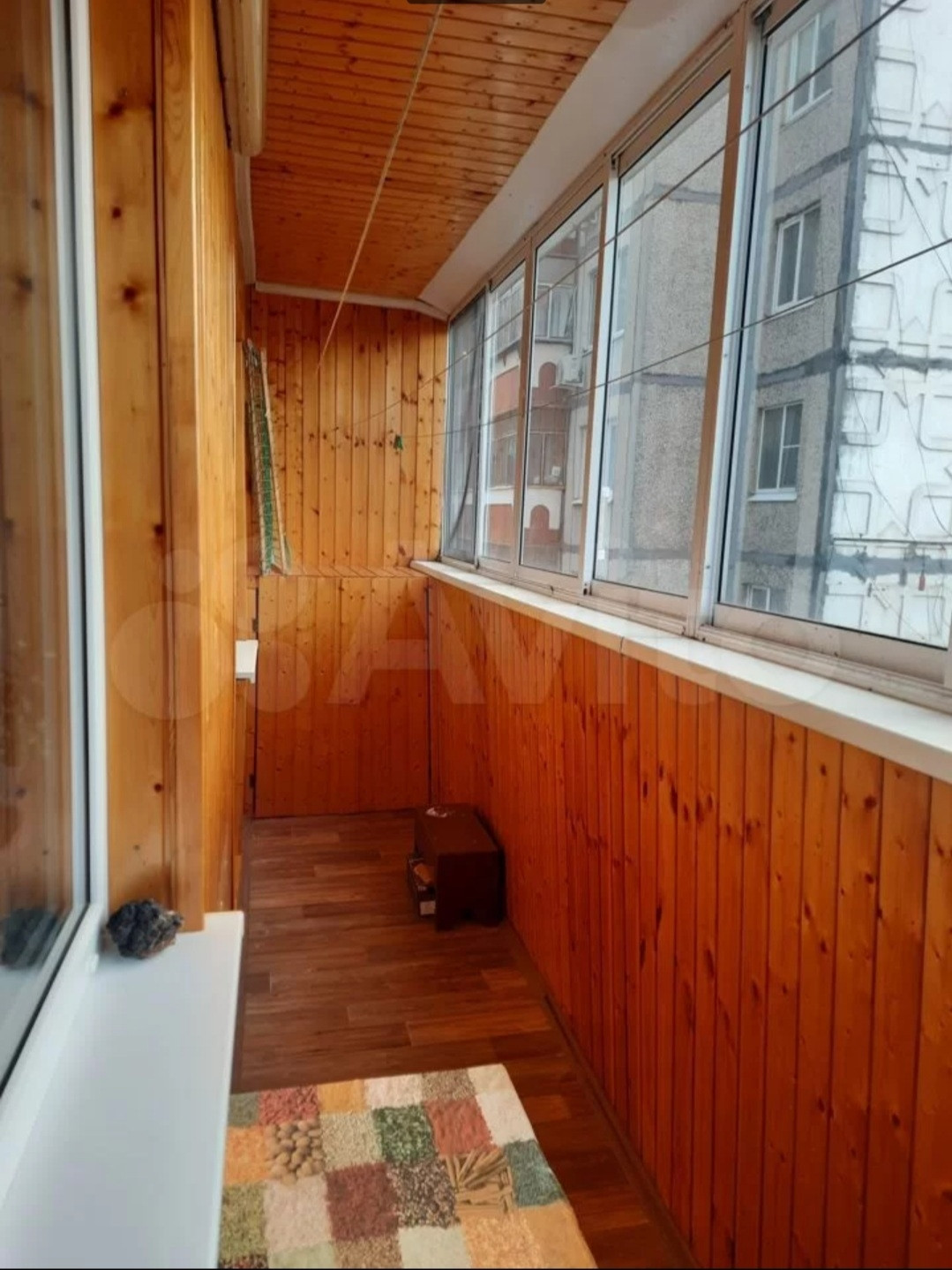 - большой балкон на кухню и зал, остеклен и обшит деревом.