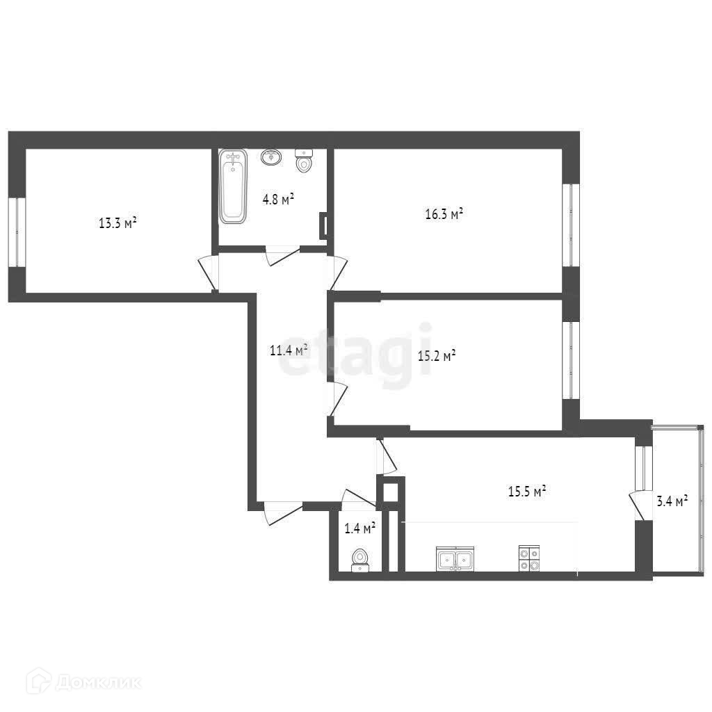 Просторная трехкомнатная квартира с большой кухней-гостинной и тремя раздельными комнатами. Два сан.узла, окна выходят на разные стороны. Все комнаты правильной прямоугольной формы.