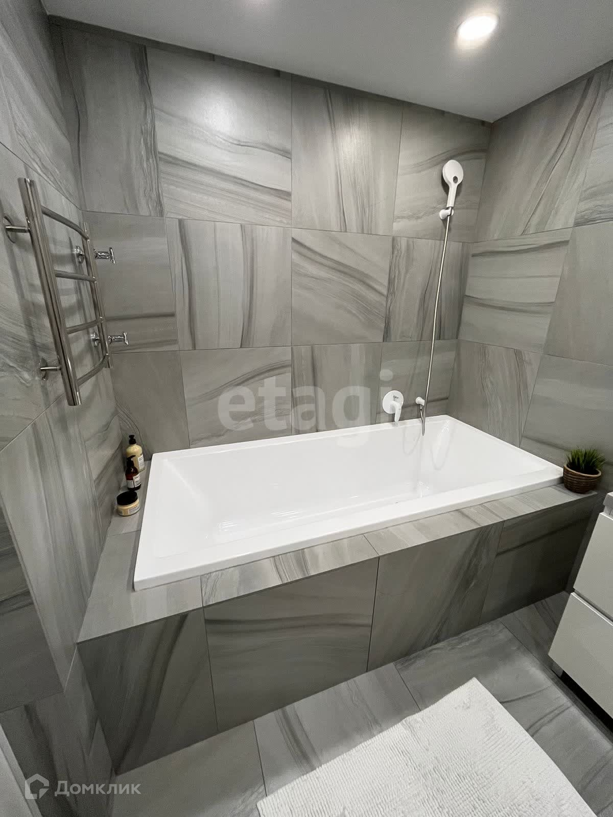 В ванной комнате стены и пол сделаны из итальянского керамогранита. Имеется скрытый люк в который вмонтирован плоский водонагреватель итальянской фирмы ARISTON (80л). Большая и очень просторная прямоугольная 2-ух метровая ванная. Все краны в ванной комнате немецкой фирмы GROHE. Подвесной унитаз со встроенной инсталяцией швейцарского бренда Geberit.