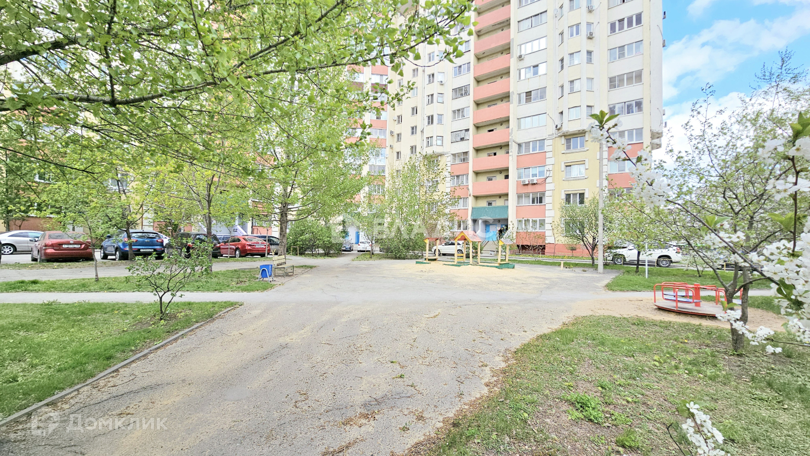 Просторная парковка около дома, детская площадка.