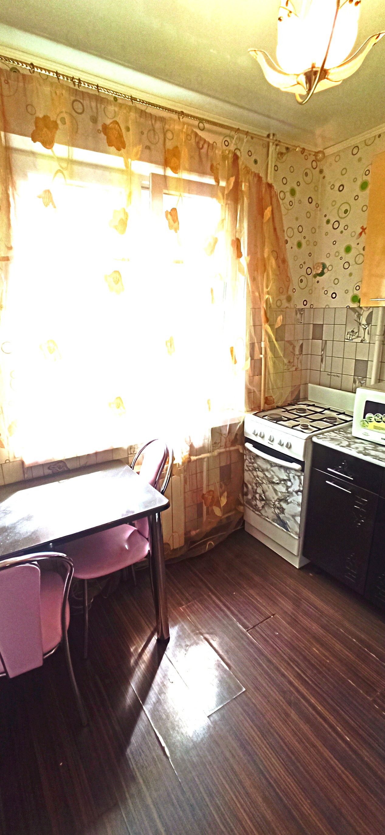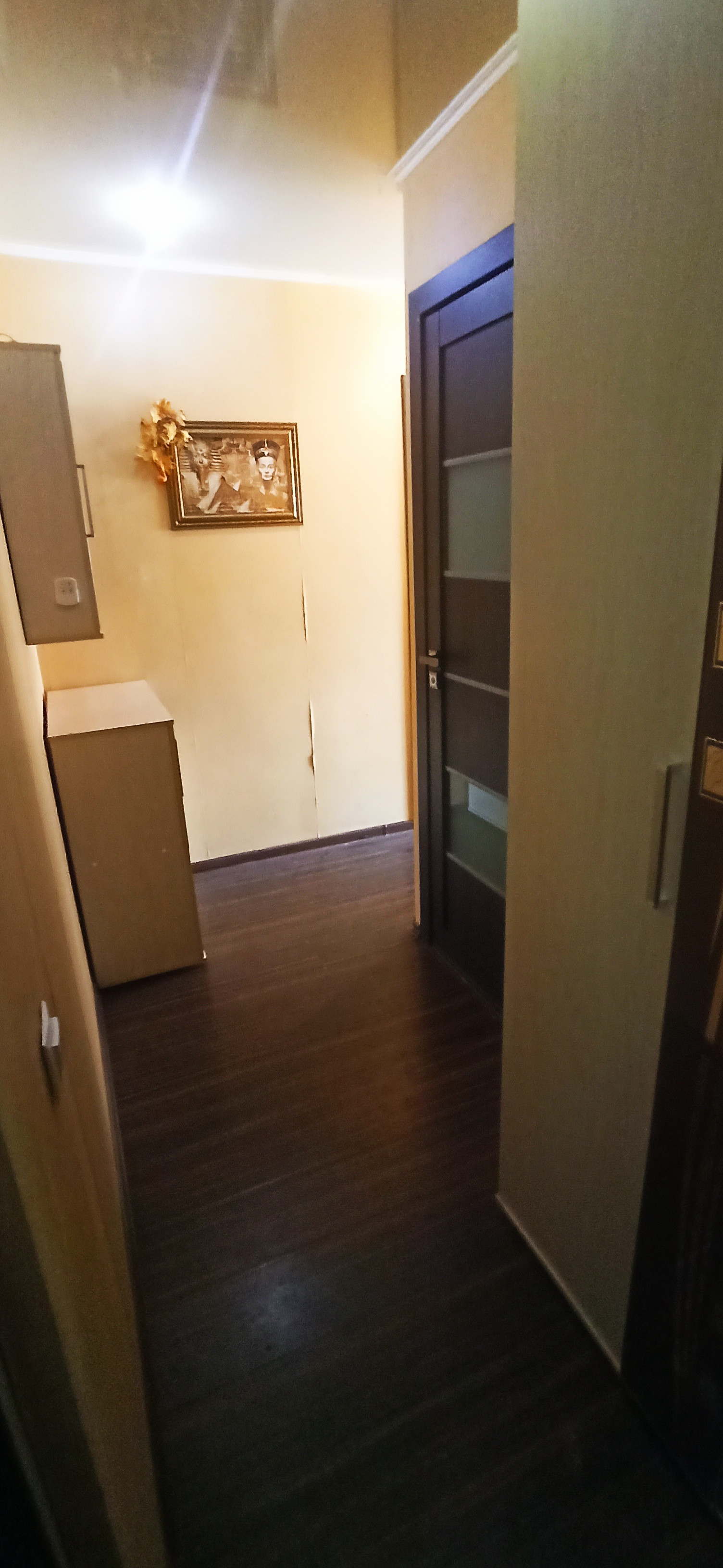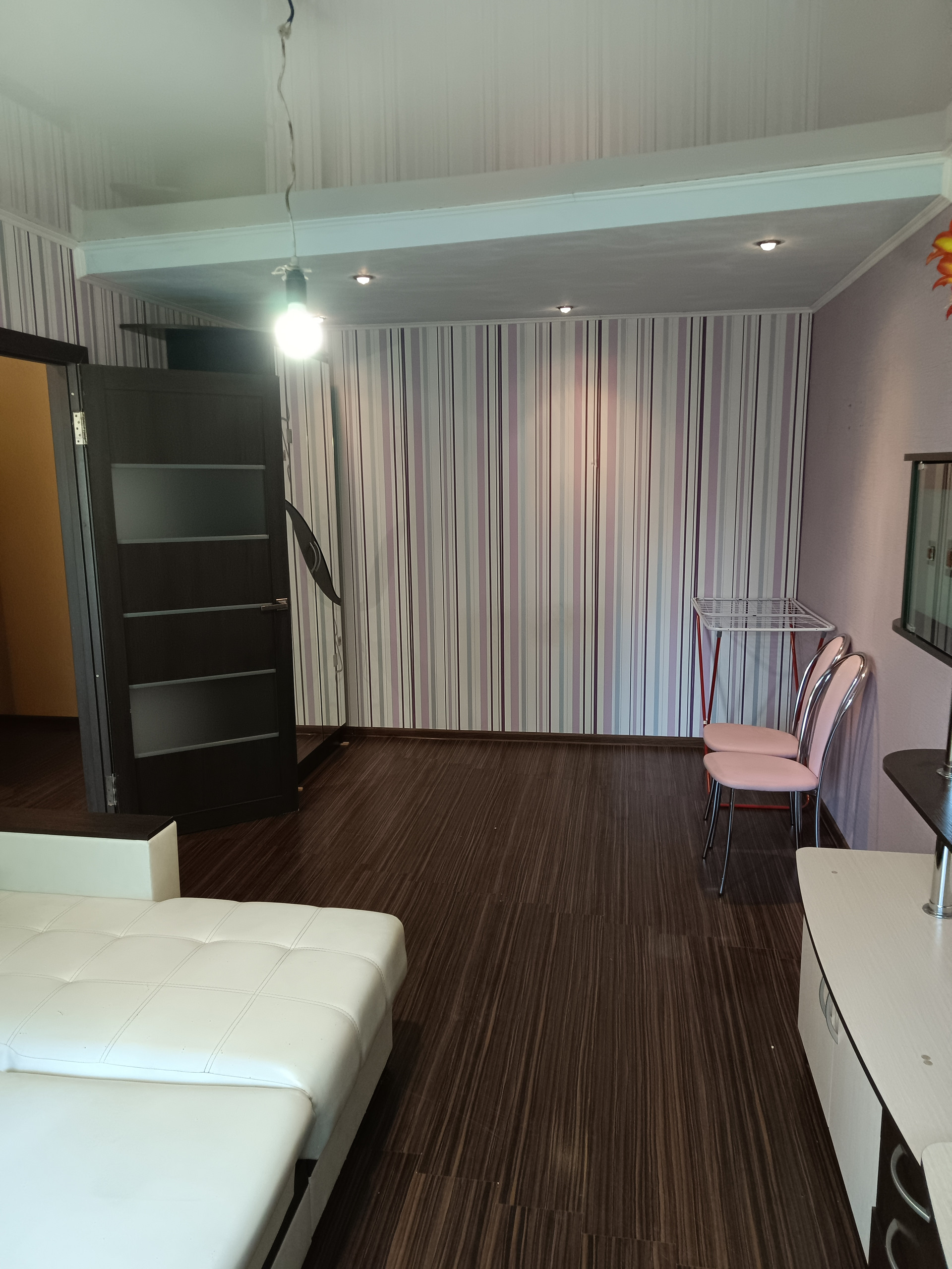 Большая комната 19,5 кв.м. с разделенными освещением зонами с выходом на балкон ( не застеклен). Светлая кухня с гарнитуром. Совмещенный санузел в современной плитке.