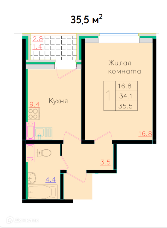 Общая площадь 35.5 м2