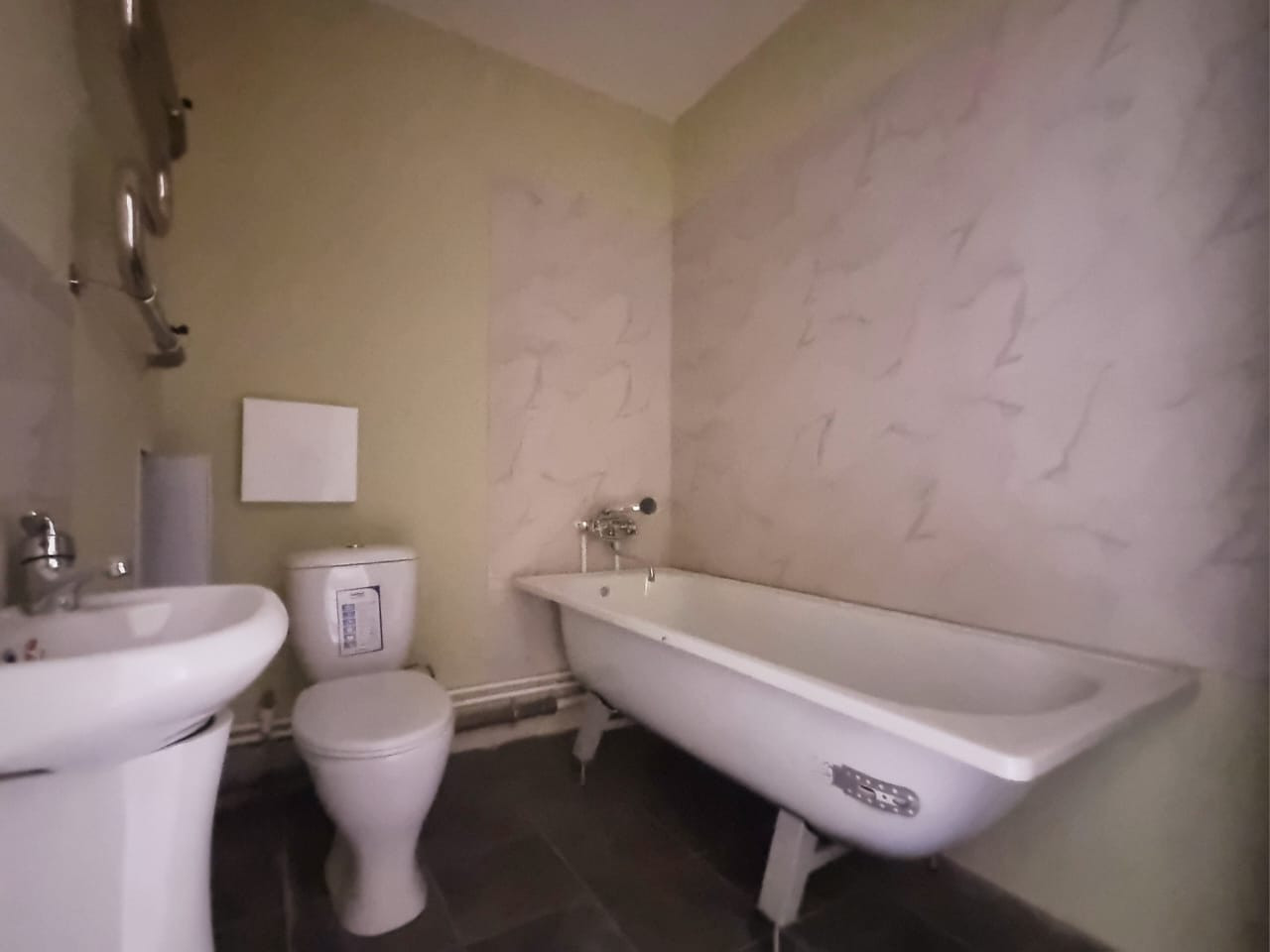 Санузел: плитка в мокрых зонах, установлены ванная, унитаз, рукомойник