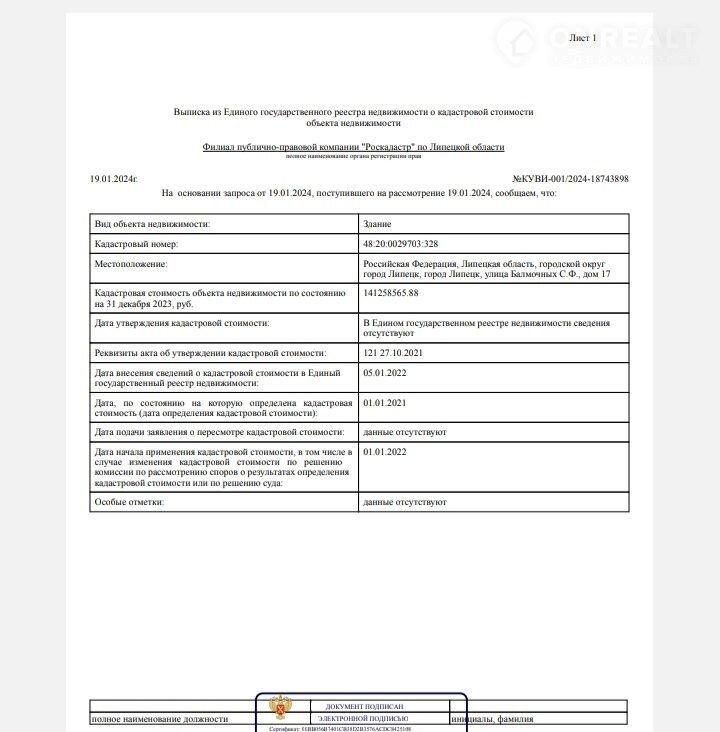 Стоимость недвижимости: