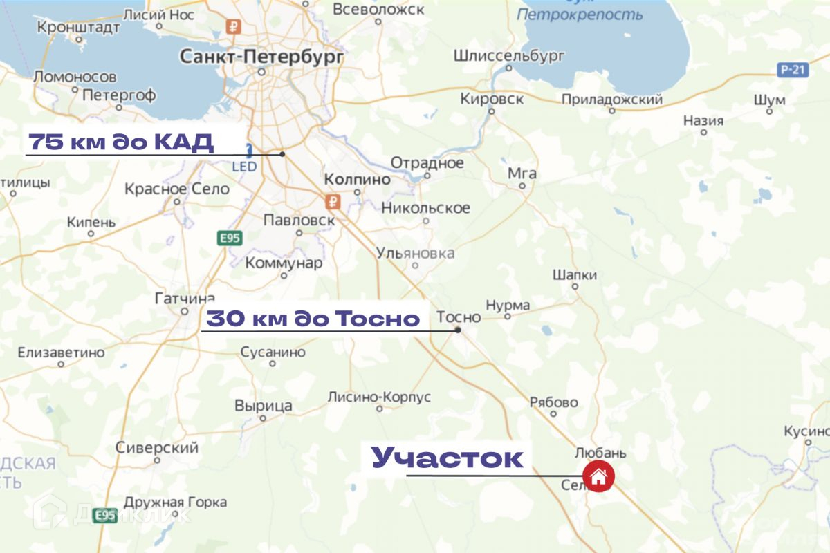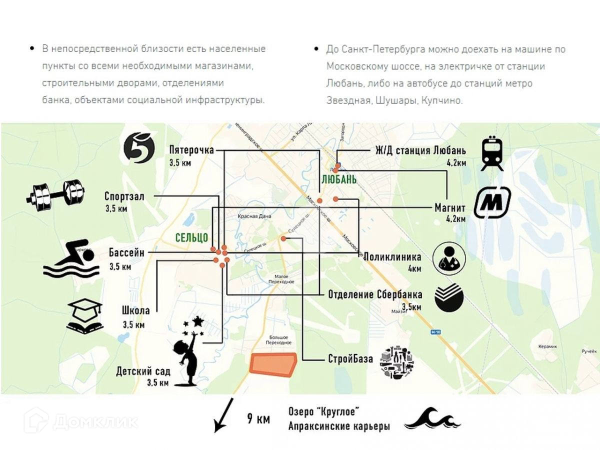 От  Санкт-Петербурга 75 км, можно доехать на автомобиле по Московскому шоссе М-10, скоро будет съезд с М-11 (платная). На электричке до станции Любань, либо на автобусе до станций метро Звездная, Шушары, Купчино.