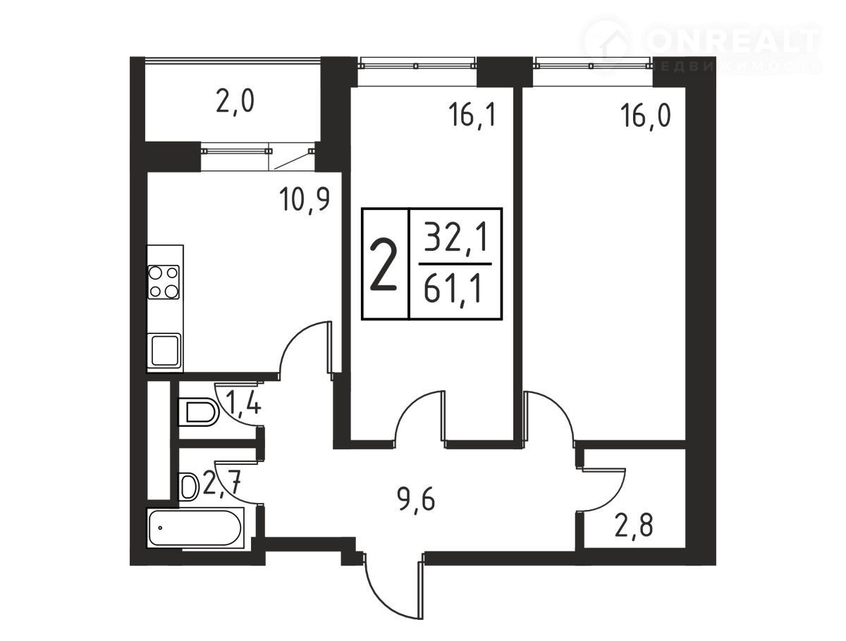 Общая площадь 61.1 м2