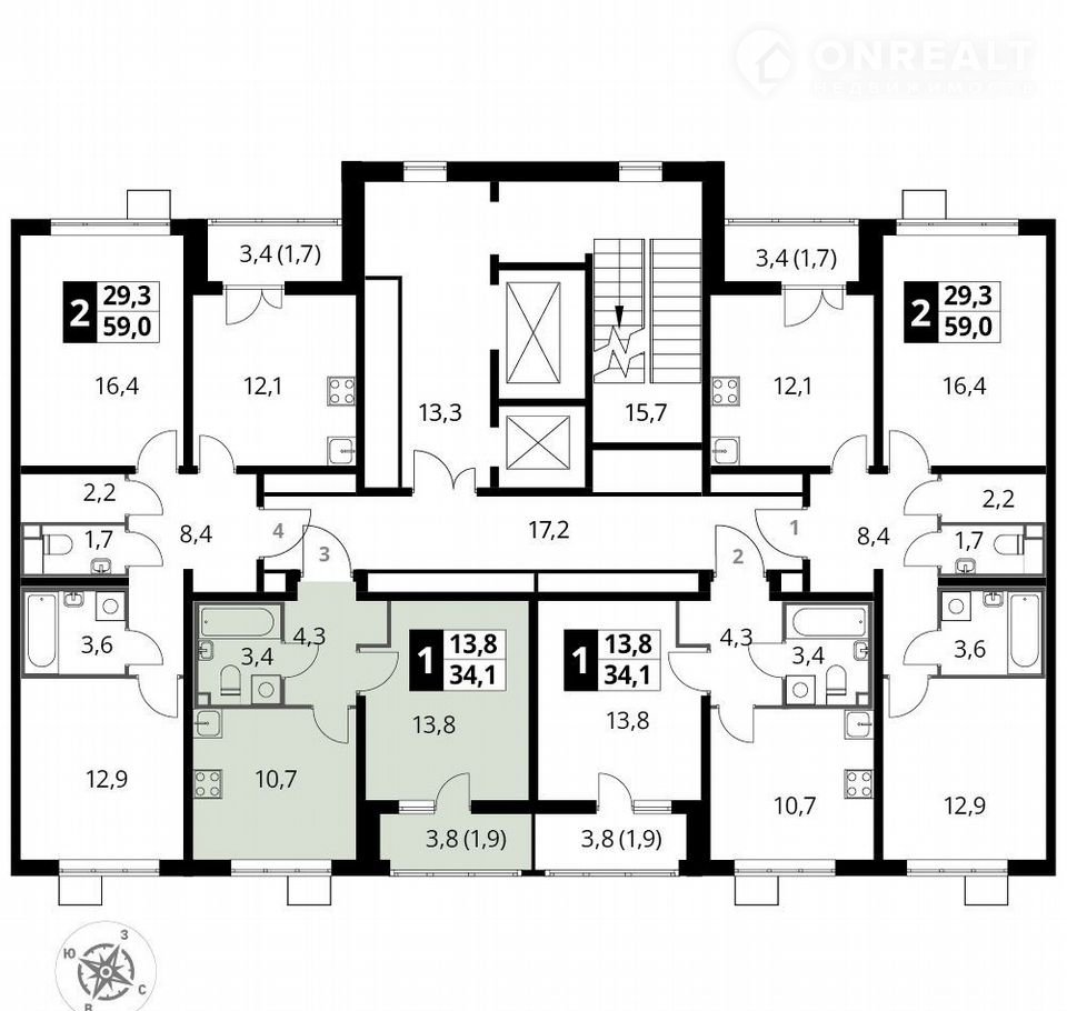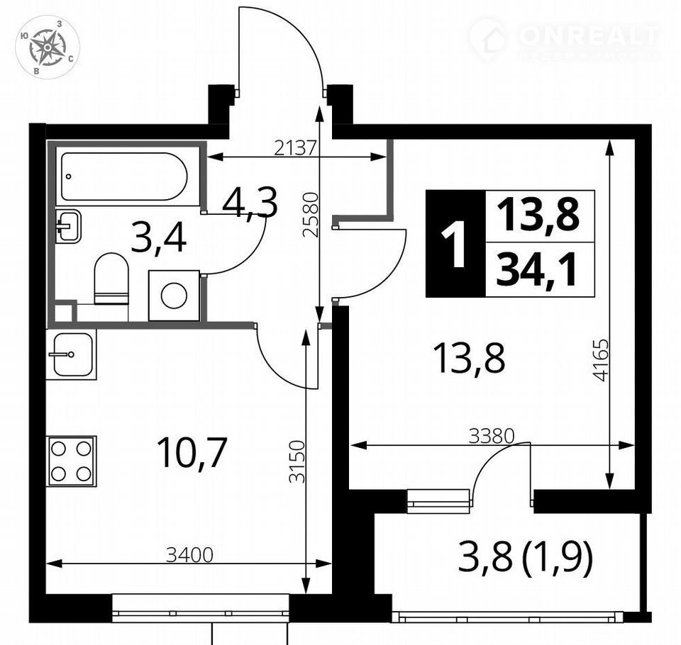 Общая площадь 34.1 м2