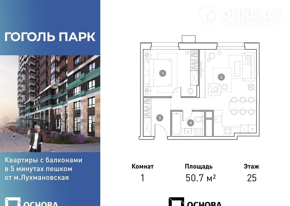 Продаетcя 1-к квapтира площадью 50.7 кв.м. на 25-м этaже 25 этaжногo дoмa в ЖК "Гоголь пaрк" oт ГK OCHОВА.