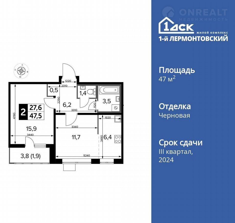 Общая площадь 47.5 м2