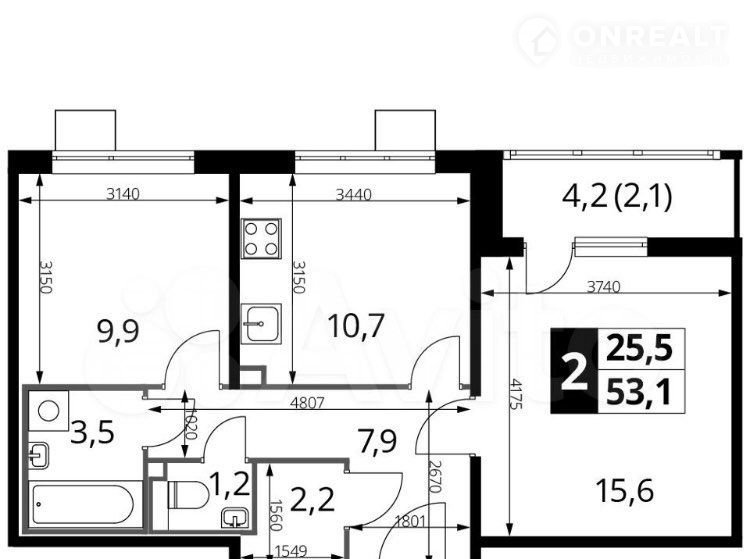 Общая площадь 53.1 м2