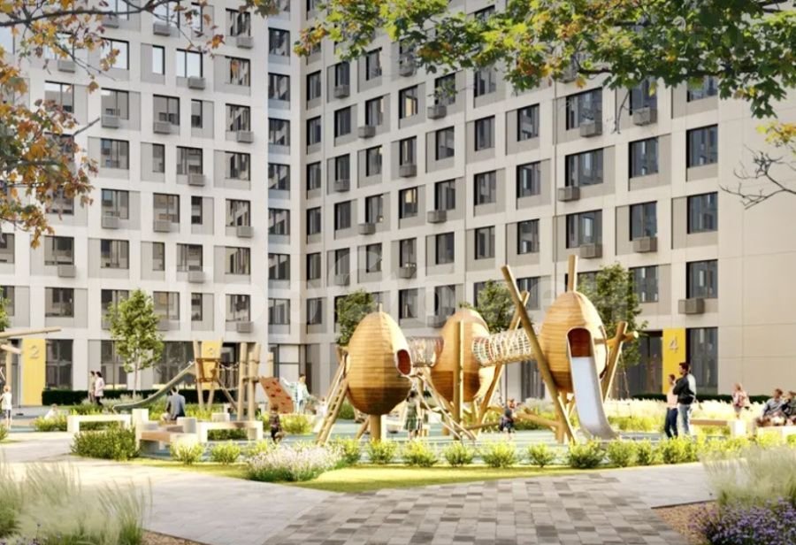 Благоустроенный двор, закрытый от автомобилей с ландшафтным дизайном, детскими и спортивными площадками, зонами отдыха, современным светодиодным освещением и многоуровневой системой безопасности.