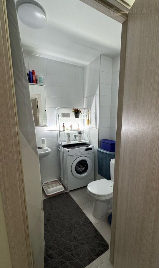 Остается встроенная кухня с барной стойкой, барными стульями, стиральная машина, диван, прихожая, кондиционер.
