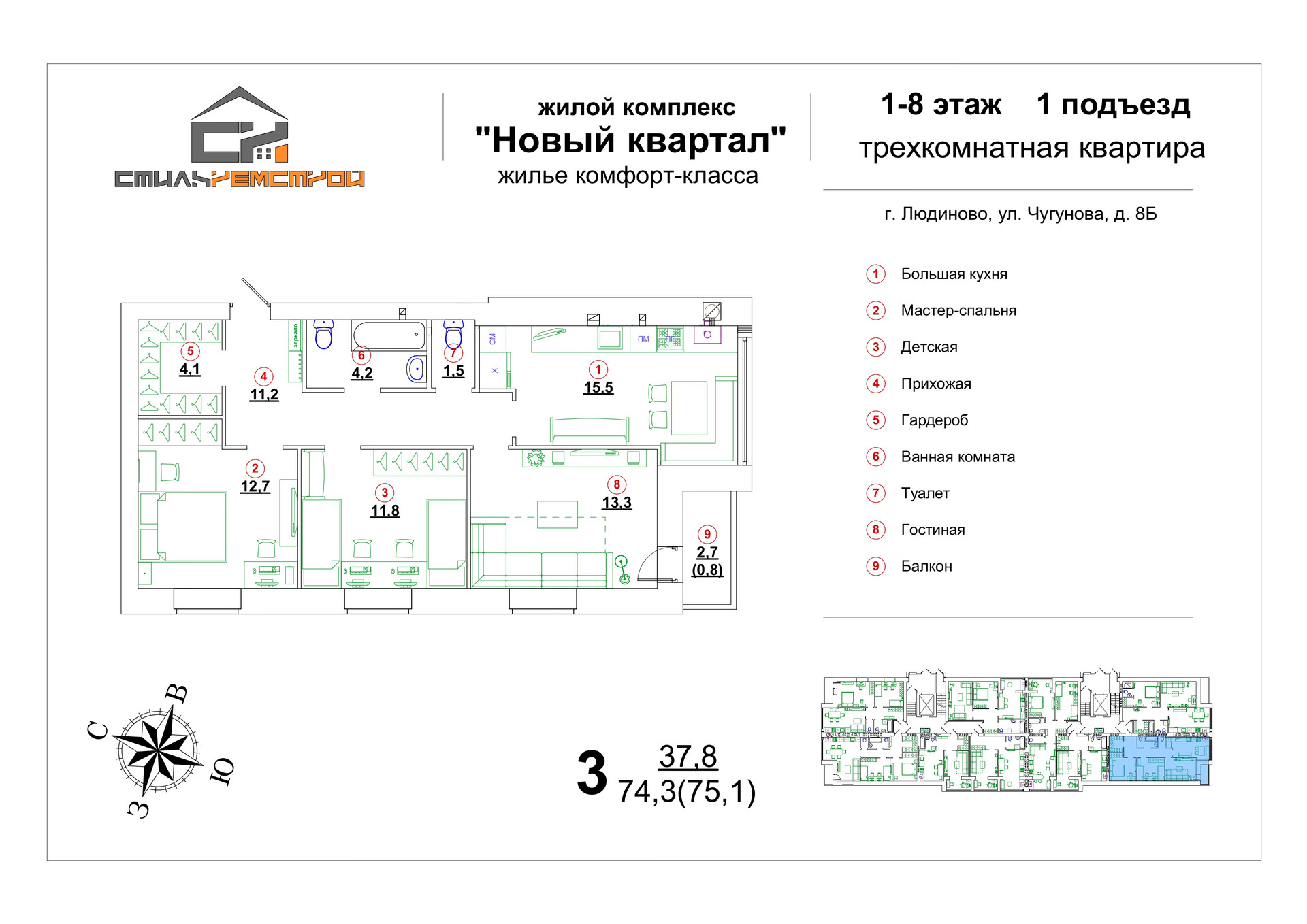 Общая площадь 74.3 м2