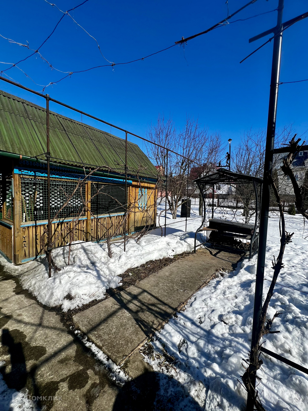 На территории: Мангальная зона ( с флюгером ), отдельно стоящая беседка, огород, плодовые и декоративные деревья и кустарники ( Яблони, вишни, виноград, черешня, шелковица, боярышник, калина, сирень .