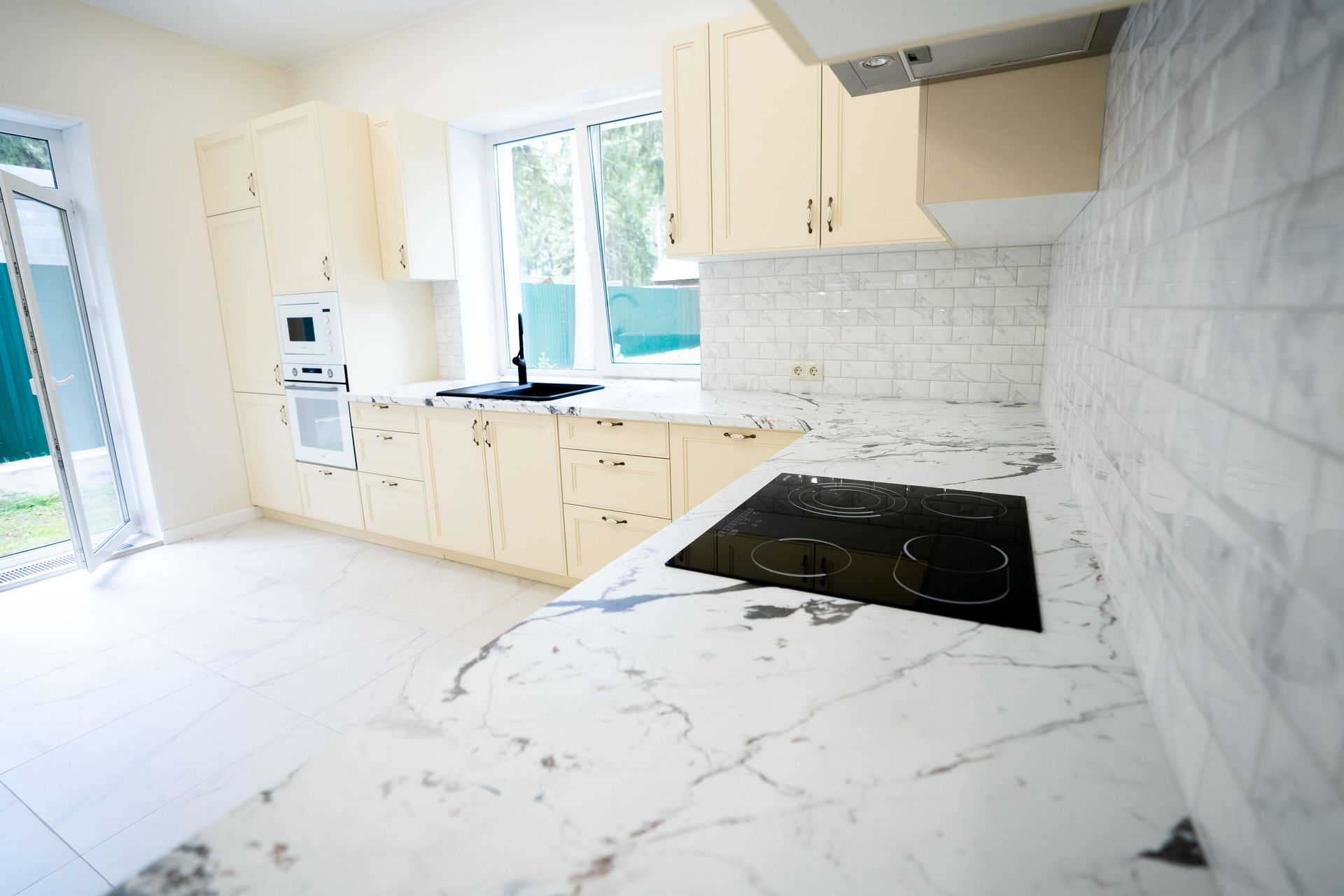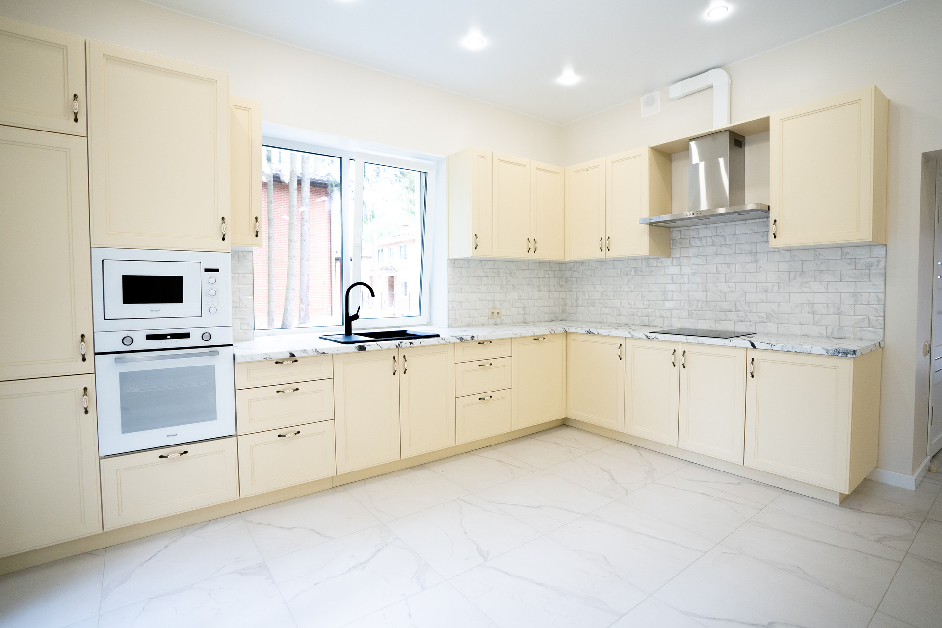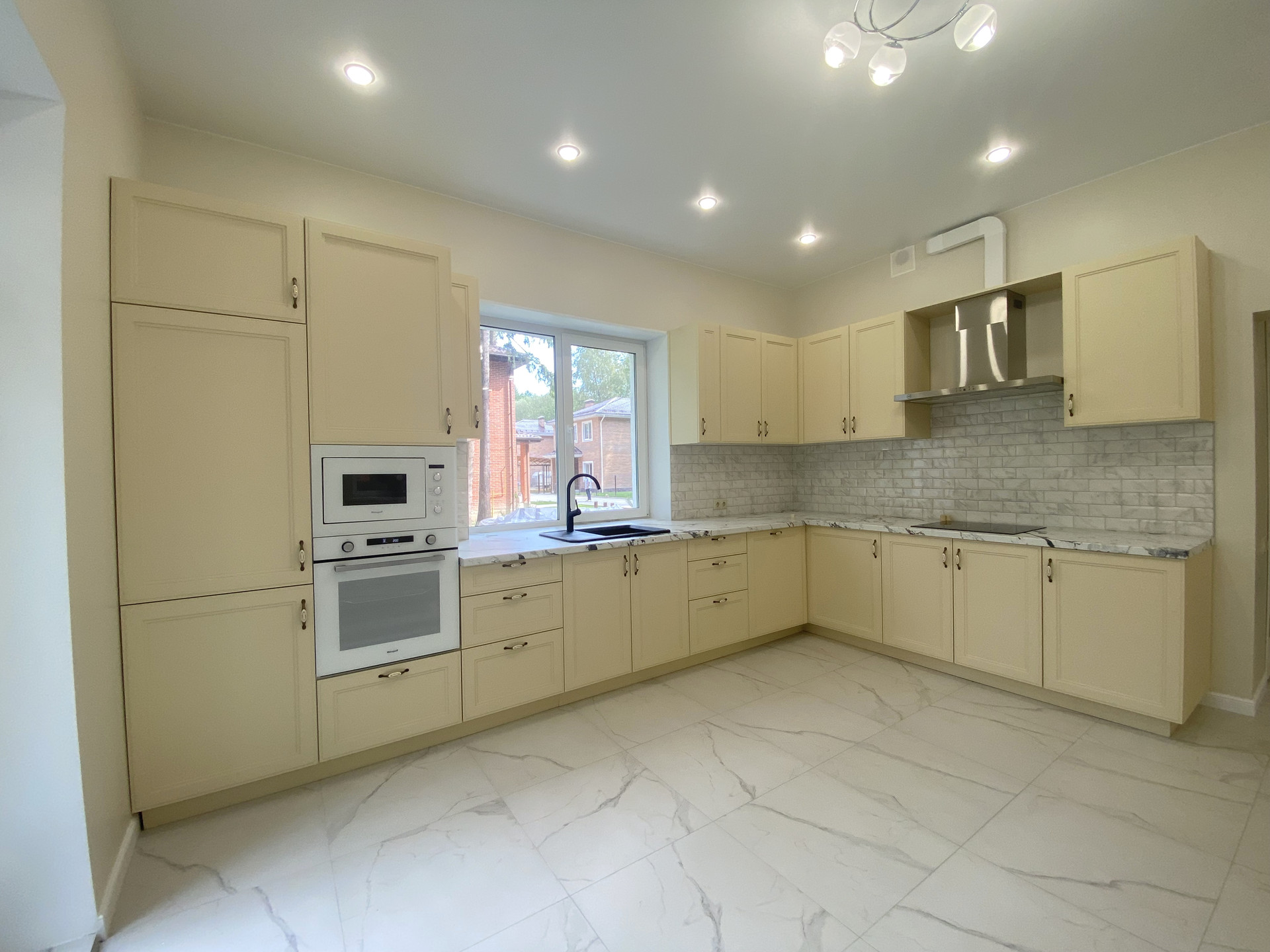 - Встроенная техника: варочная панель, духовой шкаф, вытяжка, холодильник, микроволновая печь.