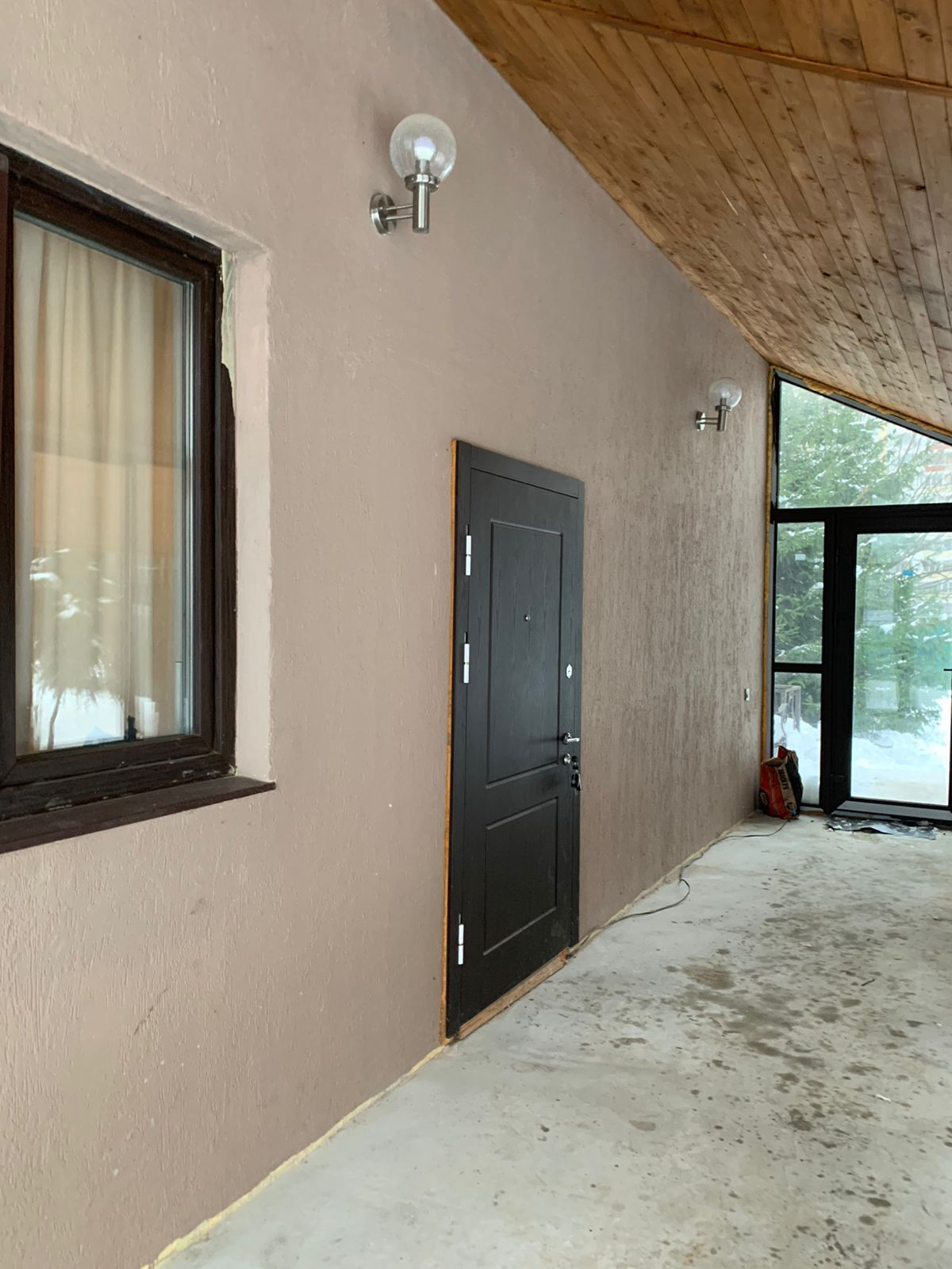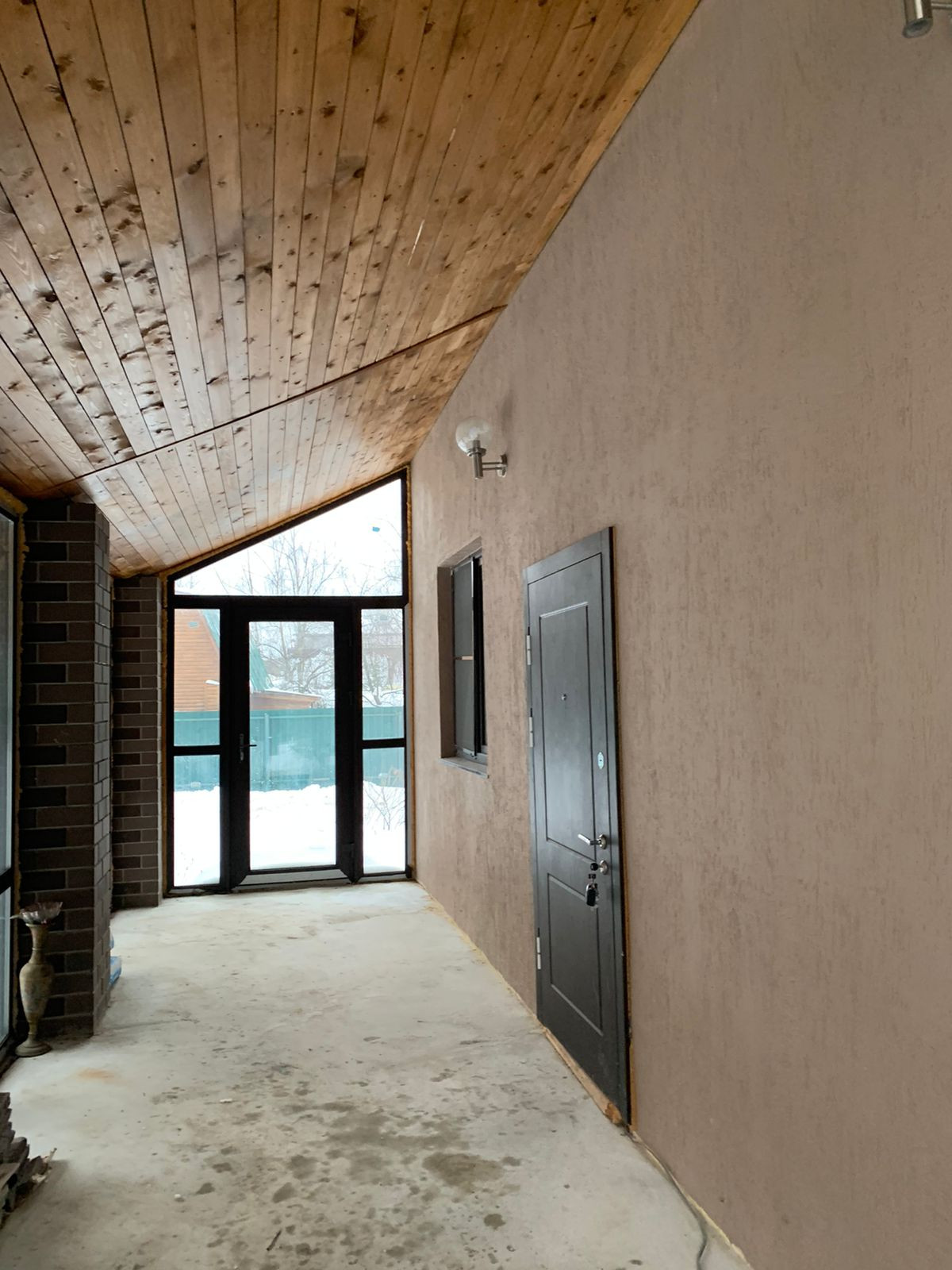 На первом этаже холодная застекленная веранда, большая гостиная, кухня, с/у, комната.