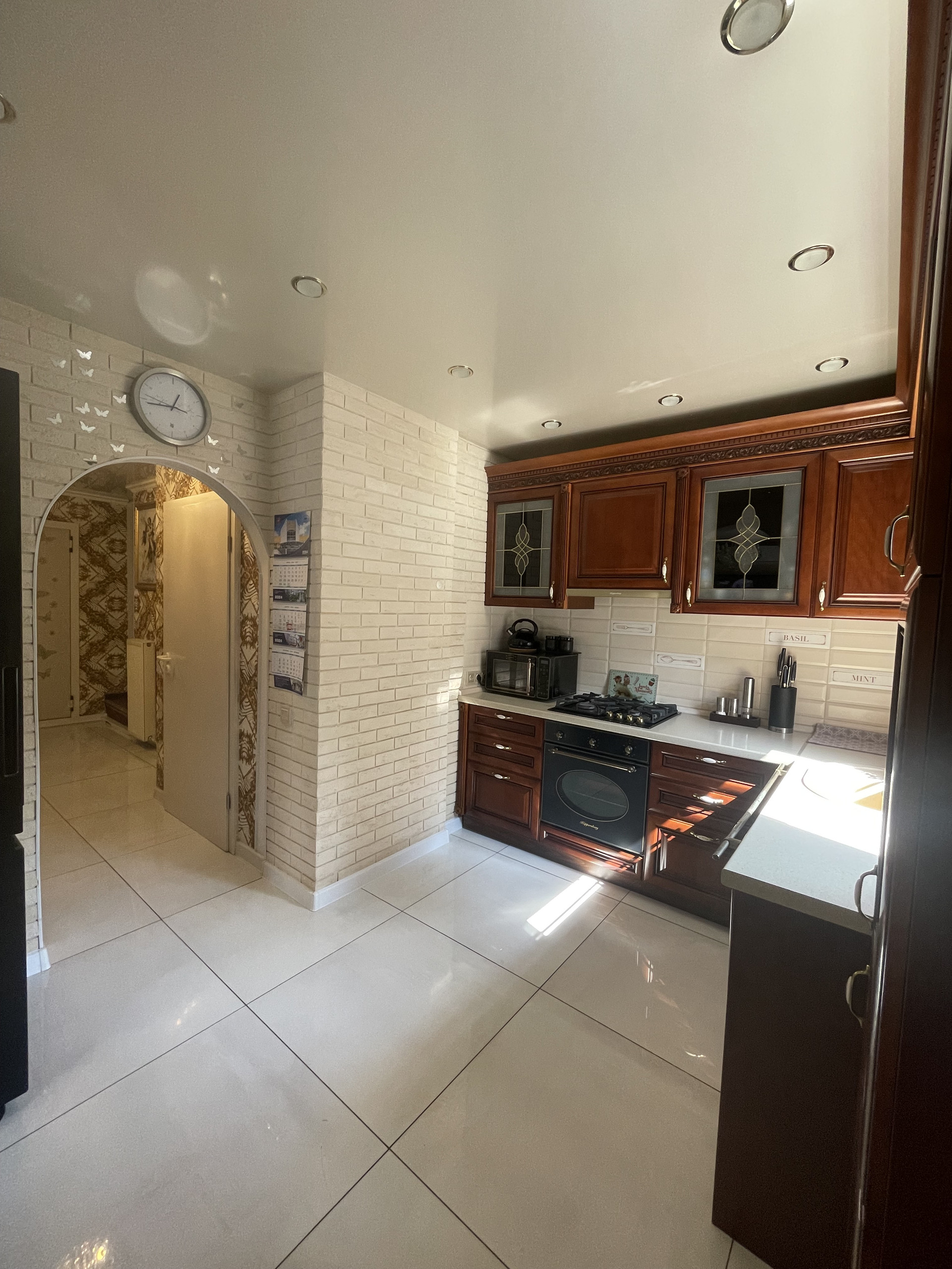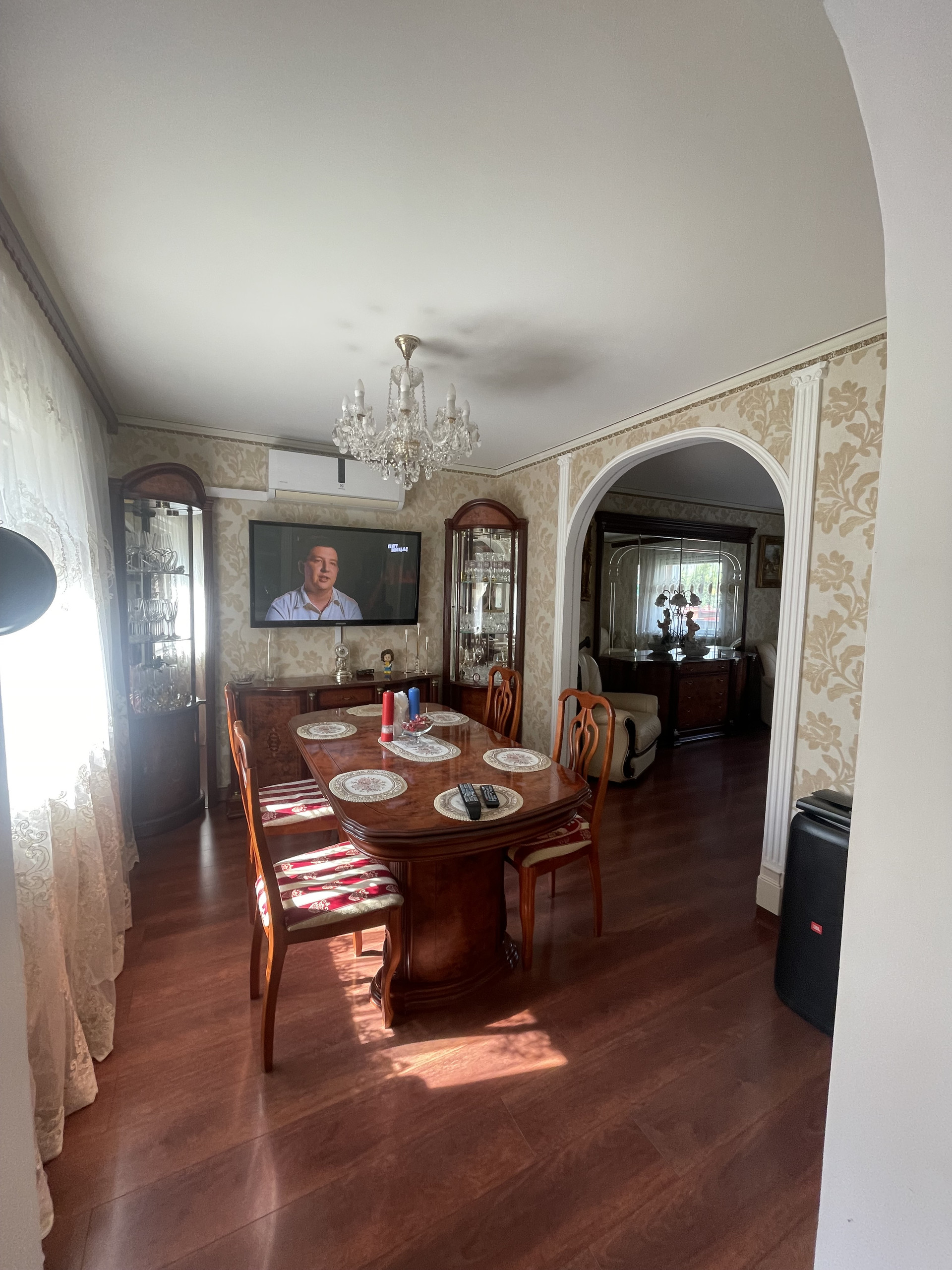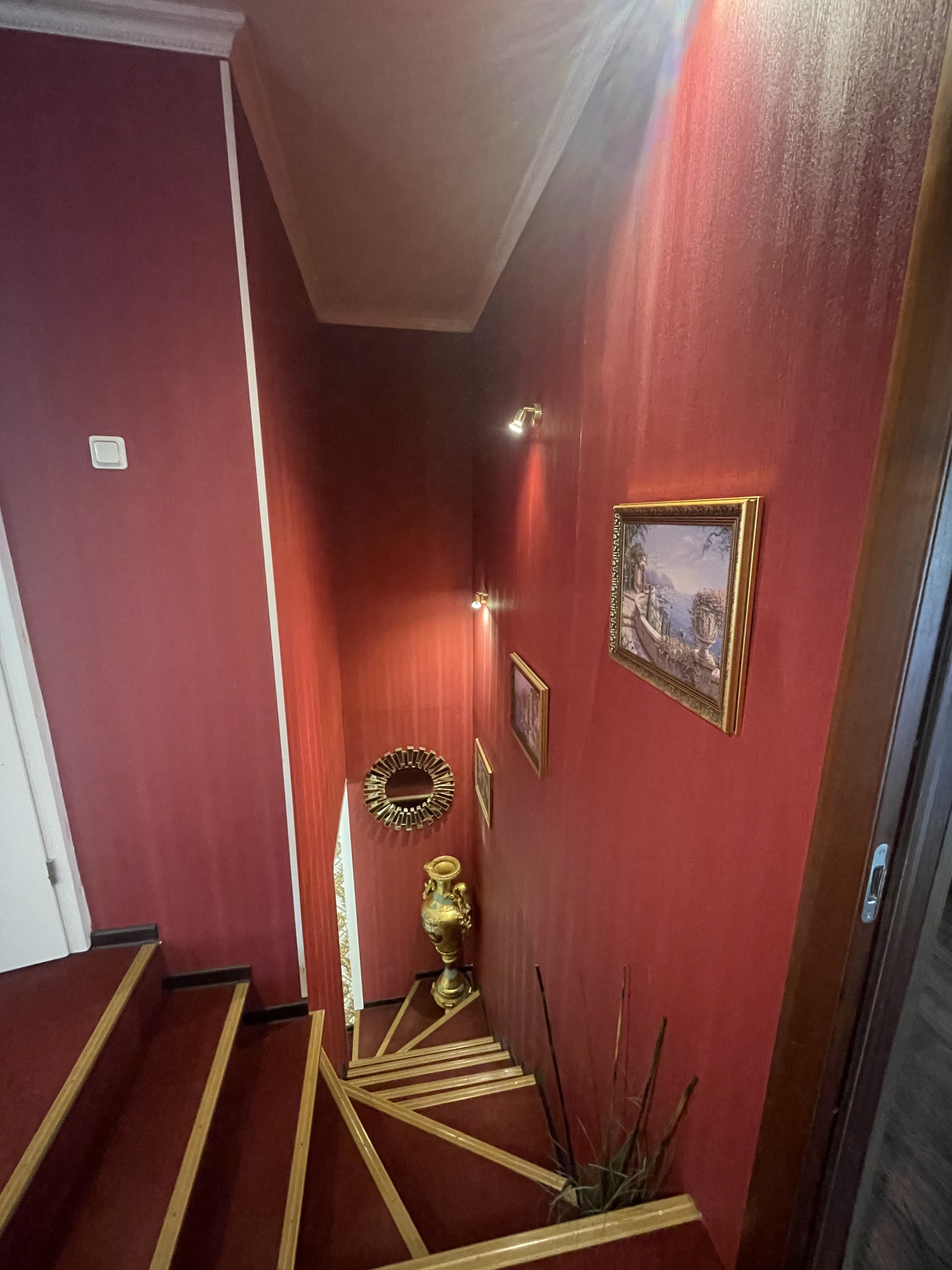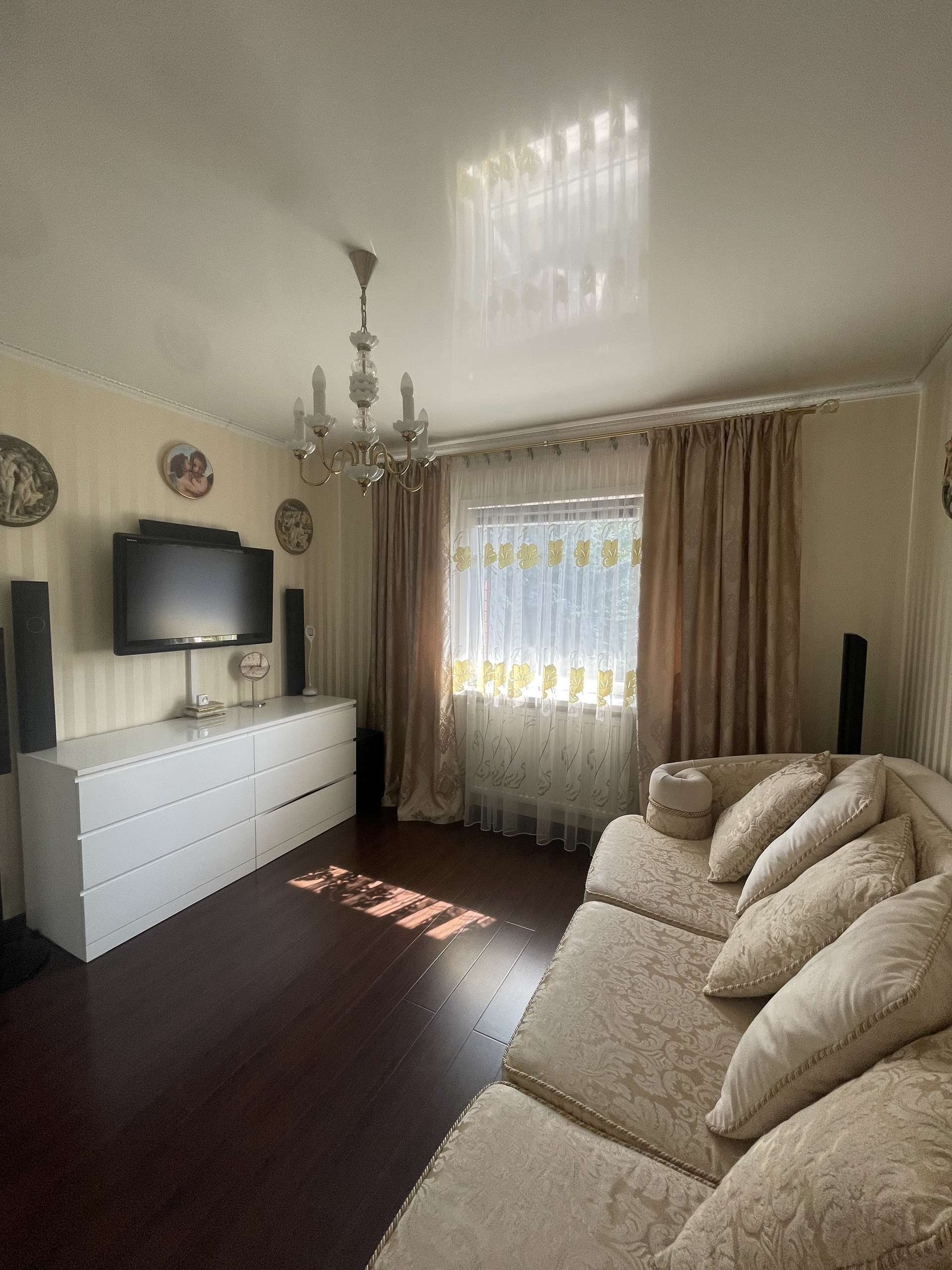 Планировка: на 1 этаже расположены просторная кухня/столовая, большая гостинная, санузел, коридор, терраса. На 2 этаже четыре спальни, санузел, лоджия. На цокольном этаже бойлерная, огромное подсобное помещение с стиральной машинкой и местом для сушки белья. Два больших гаража, один из которых отдельно стоящий от дома.