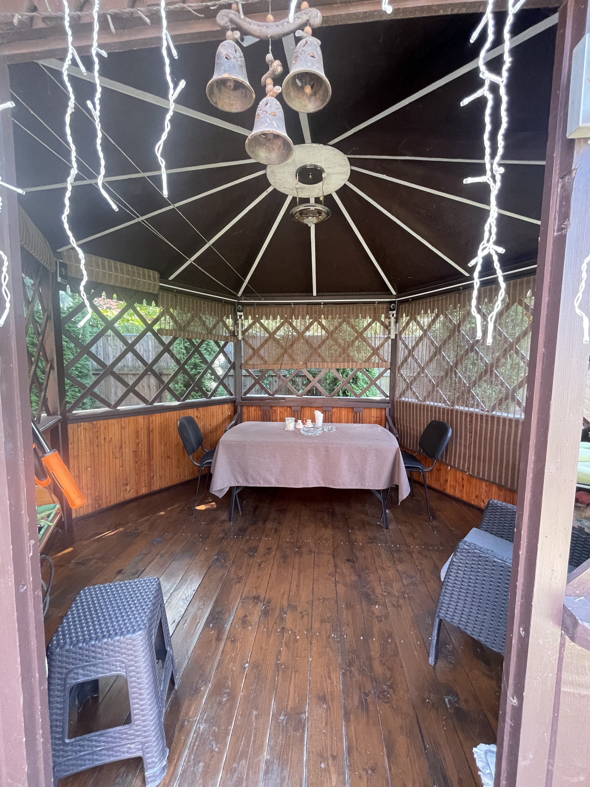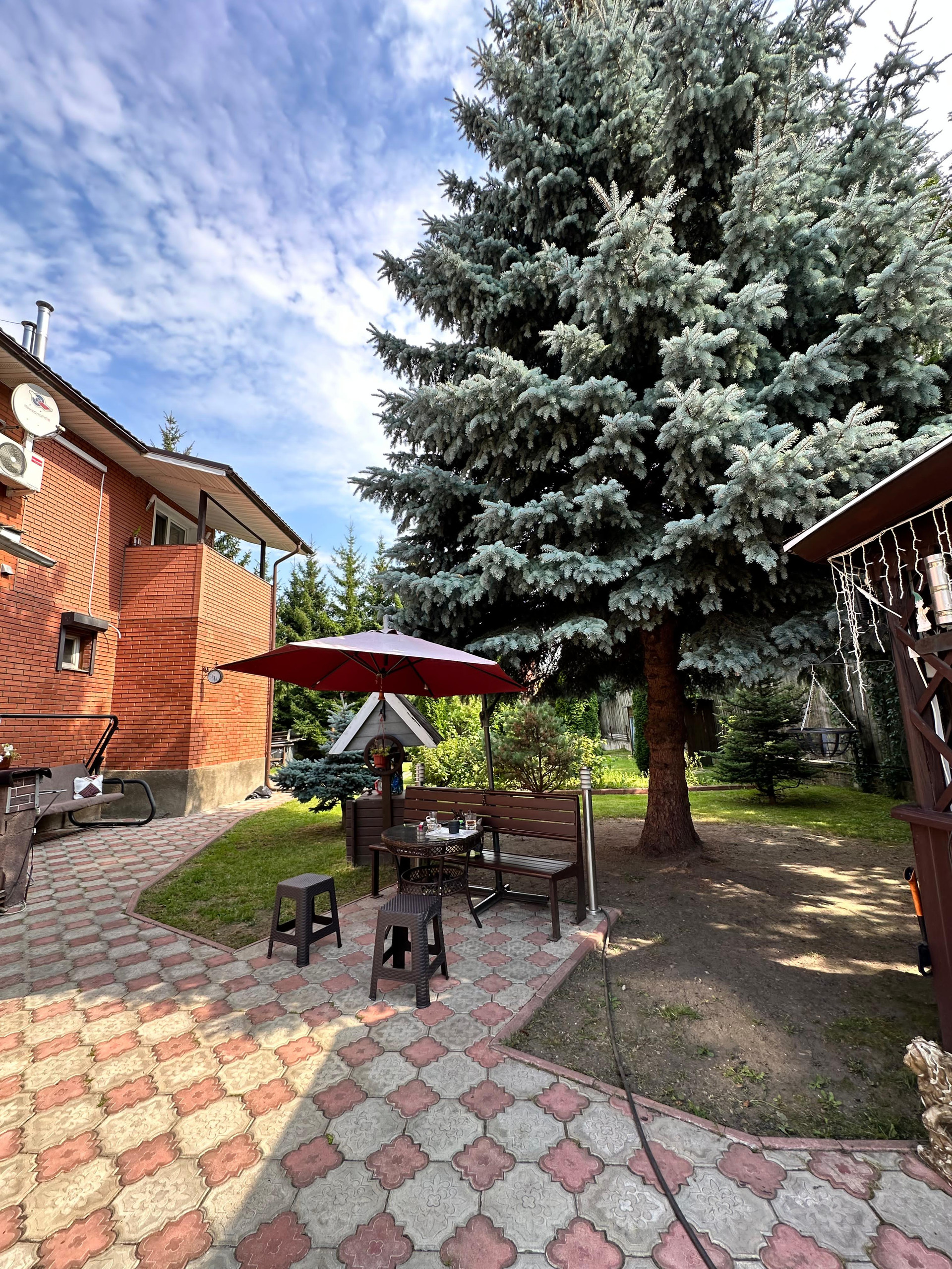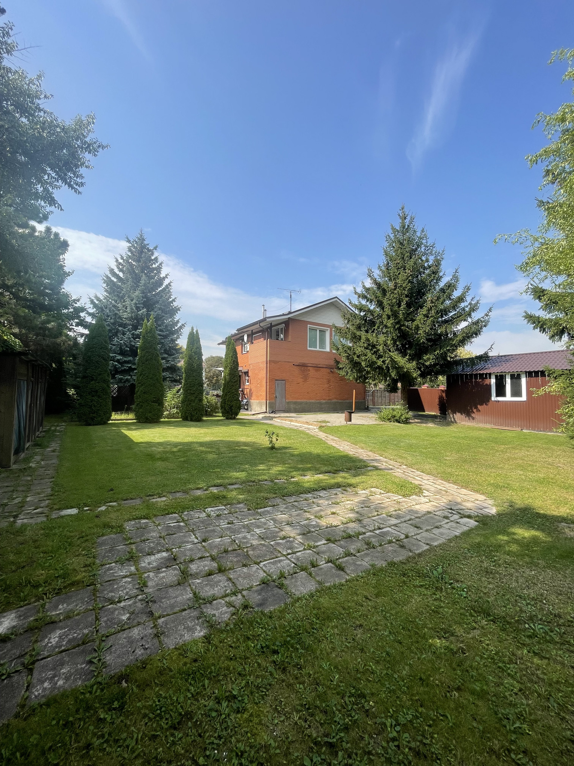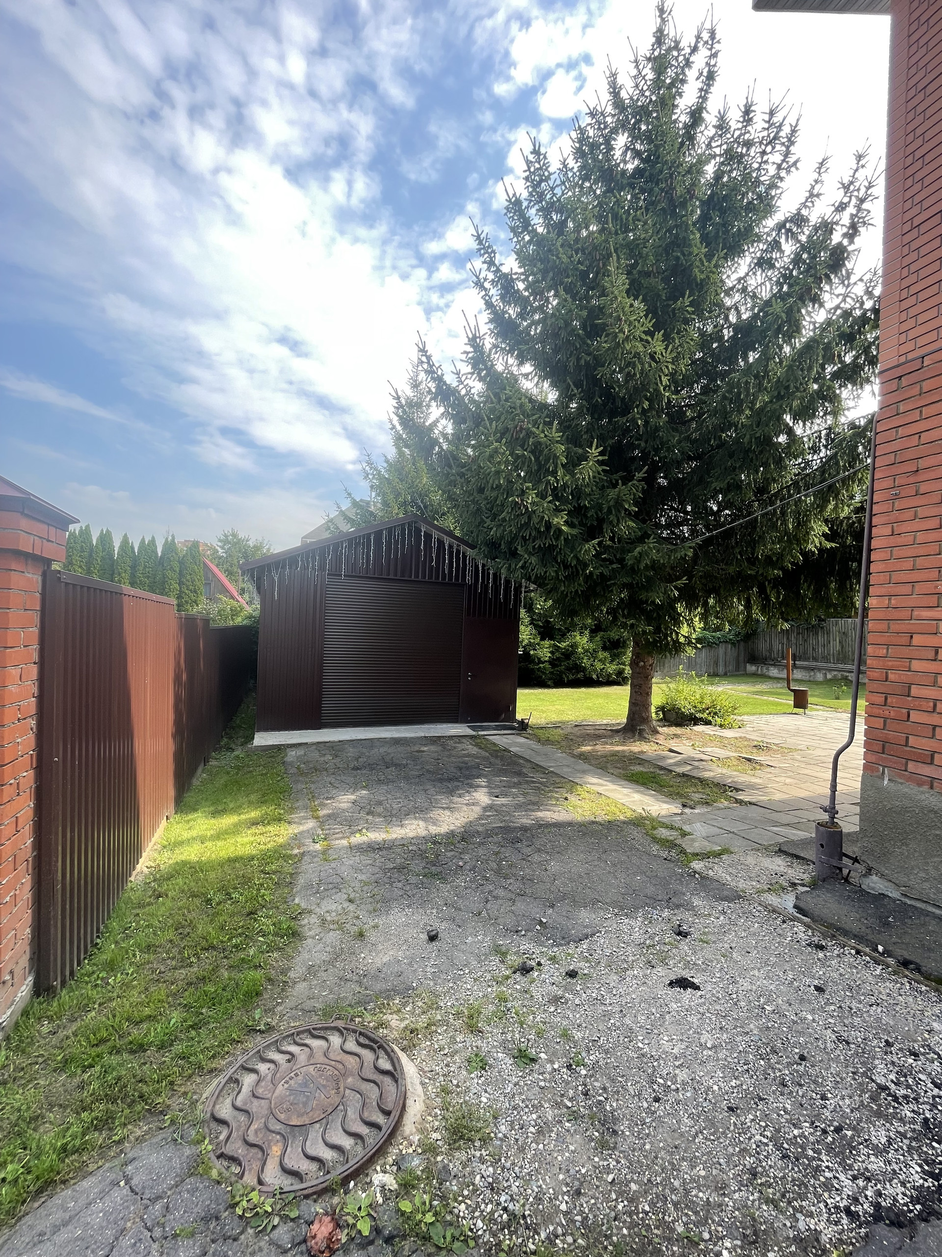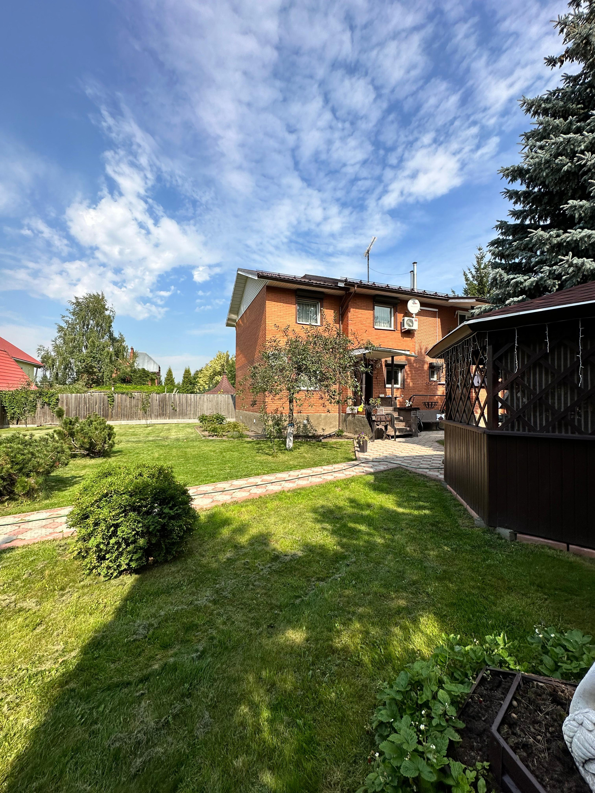 На территории: гараж, беседка, колодец, небольшая территория грядок с теплицей, плодовые деревья и кустарники, цветы, туи, голубые ели, газон и мн.др.