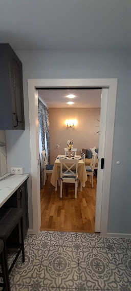 -Кухня имеет дверной проем в зал (кухня-столовая) с раздвижной дверью системы FARBO.