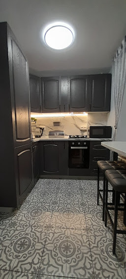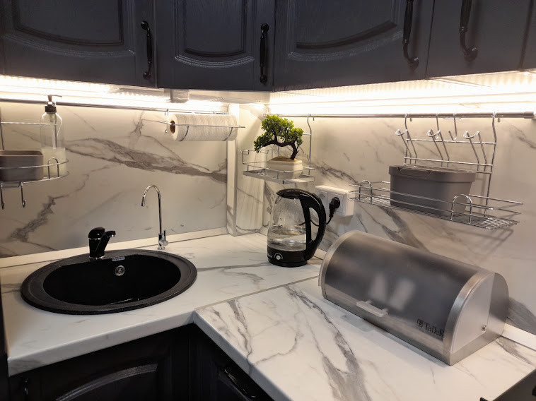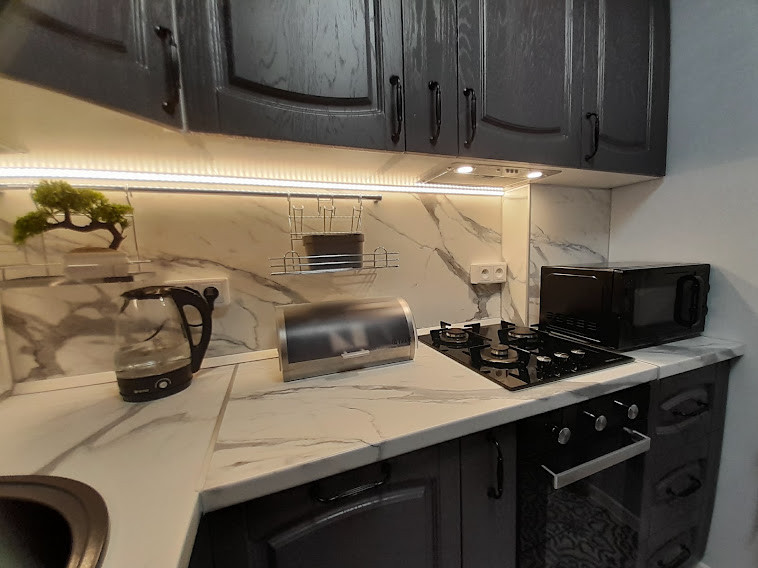 Встроенная кухня Delinea со встраиваемой техникой: * посудомоечная машина, *газовая варочная панель, *электрический духовой шкаф, *холодильник, *проточный фильтр с обратным осмосом Барьер (нет необходимости приобретать бутилированную питьевую воду), вытяжка рециркуляционная с угольными фильтрами, микроволновая печь.