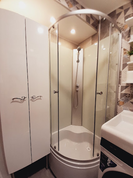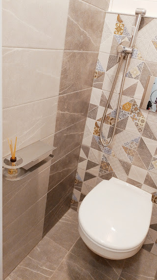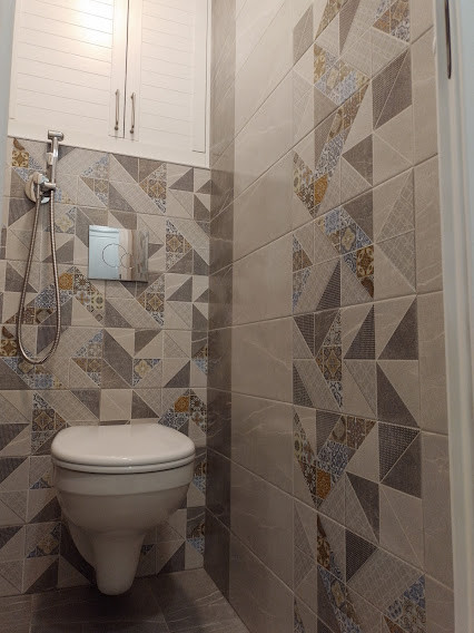 9.В туалете установлена инсталляция с унитазом и гигиеническим душем, встроенный шкаф для хранения.