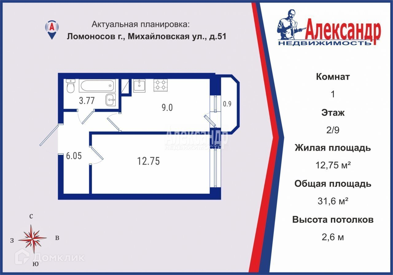 1-комнатная квартира, 31.6 м2, этаж 2 / 9, на продажу в Ломоносове, Михайловская улица, 51