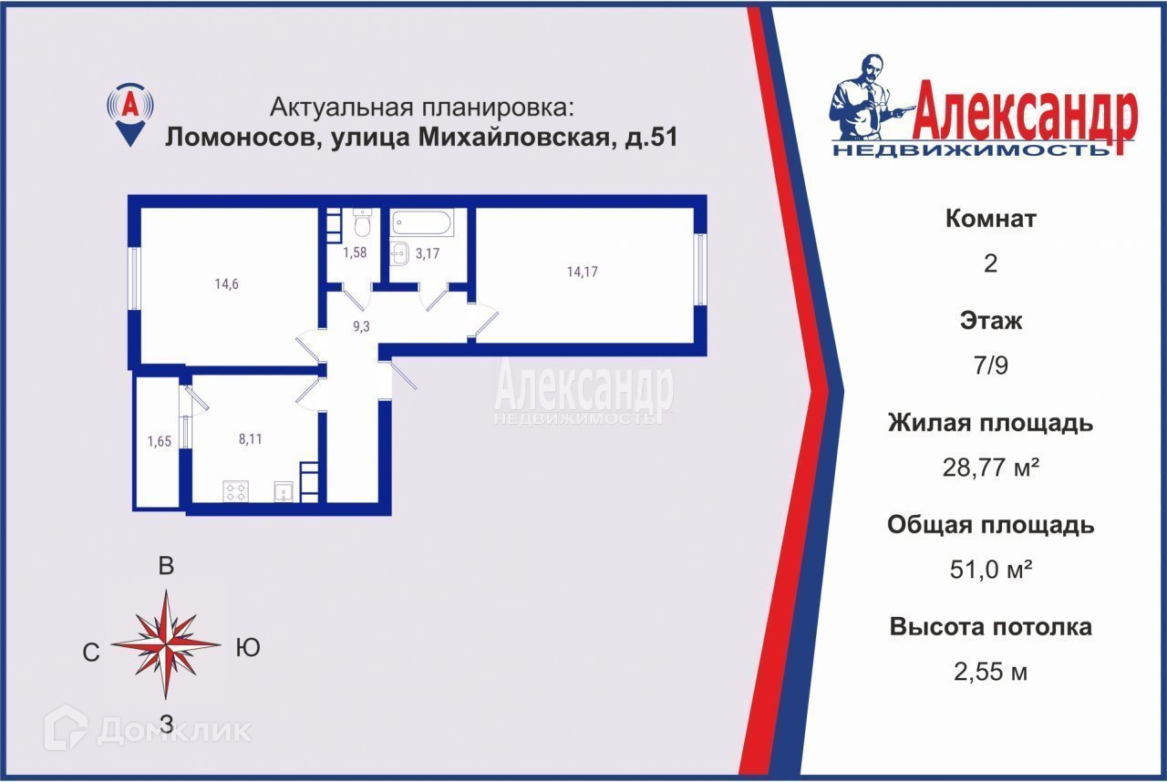 2-комнатная квартира, 51 м2, этаж 7 / 9, на продажу в Ломоносове, Михайловская улица, 51