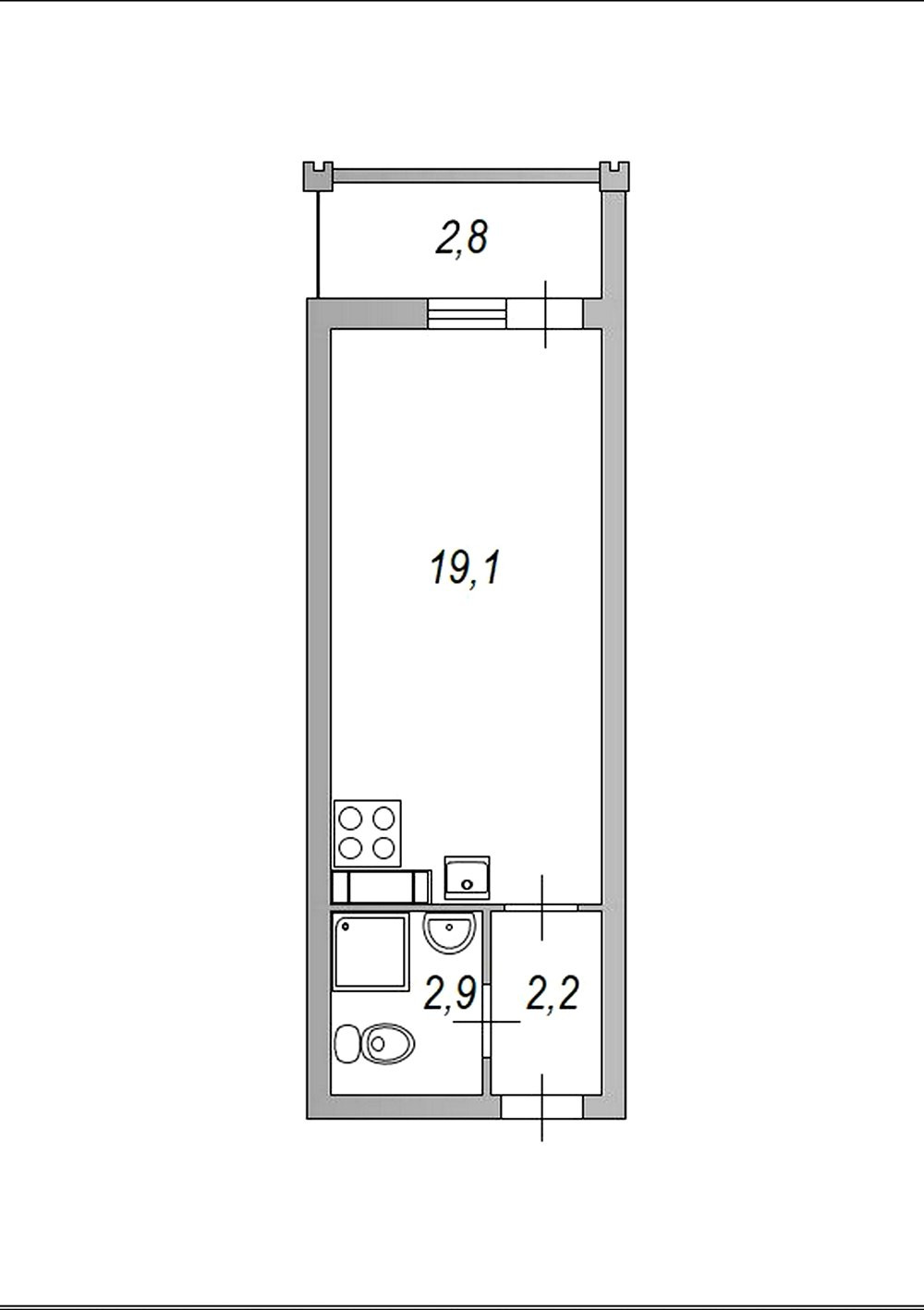 Общая площадь 24,2 кв.м. без учета балкона.