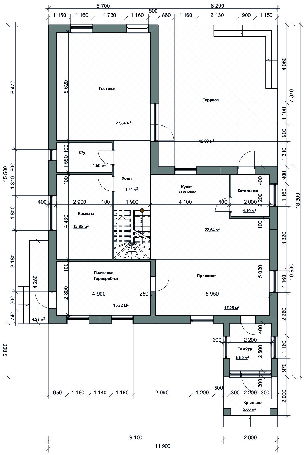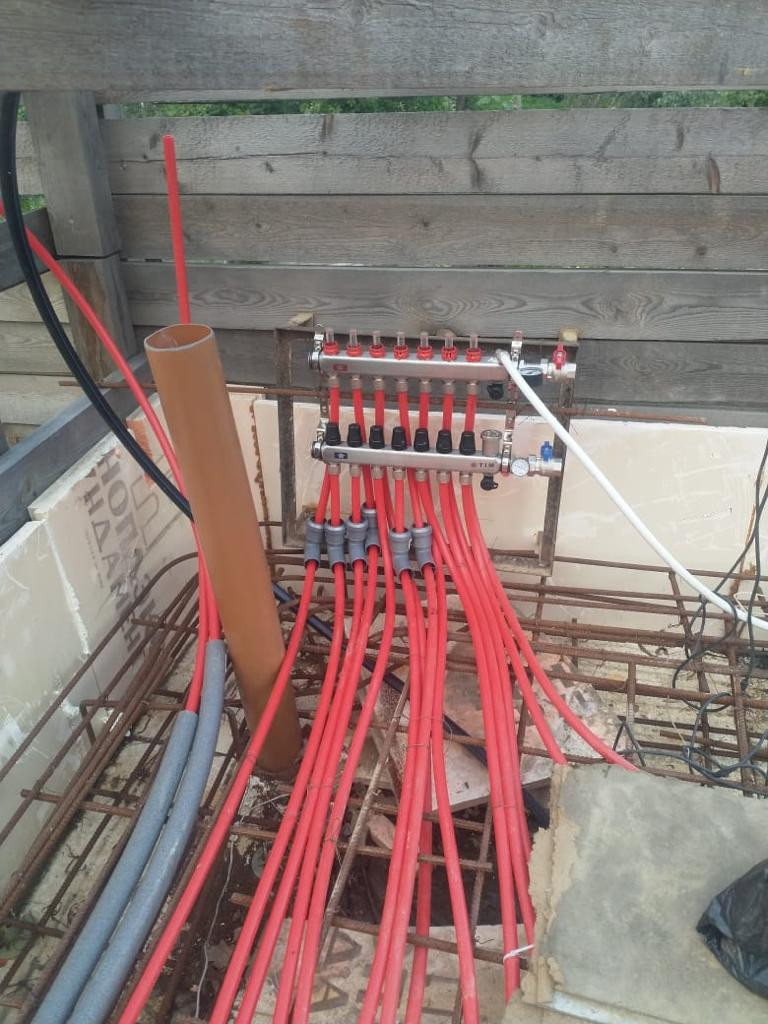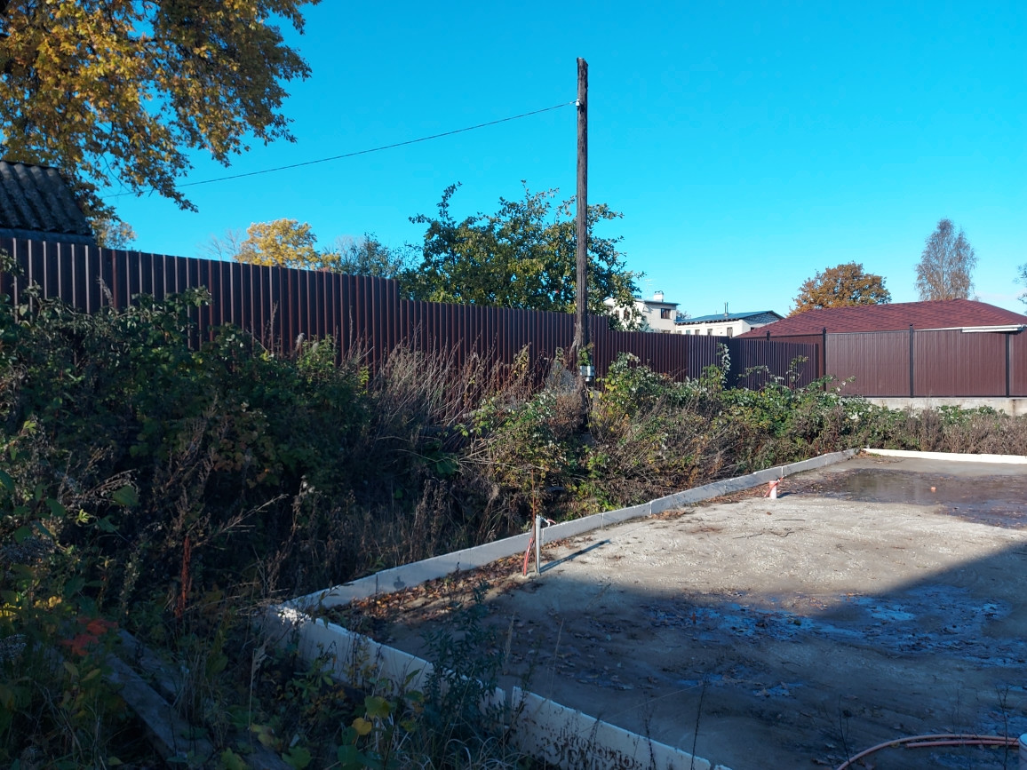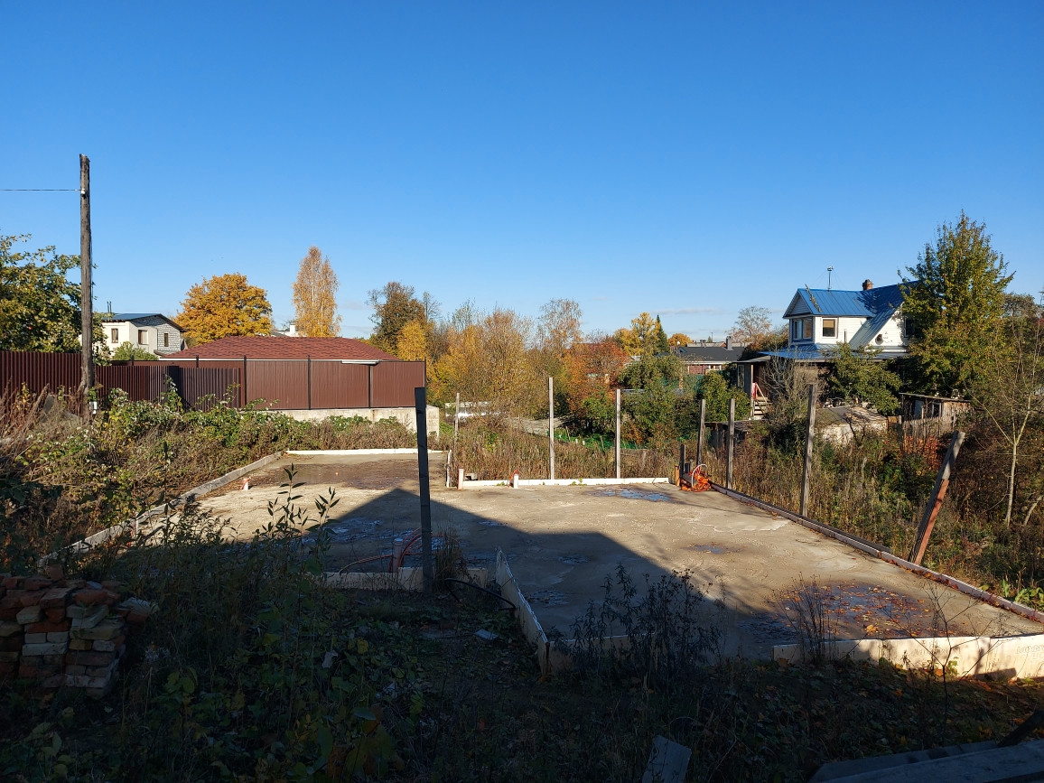 На участке сделан фундамент. Фундамент стоит на подушке из слоев песка и гравия. Внутри фундамента сделана полная разводка канализации, водоснабжения, сделана система водяного теплого пола. В бетон была добавлена микрофибра для усиления.
