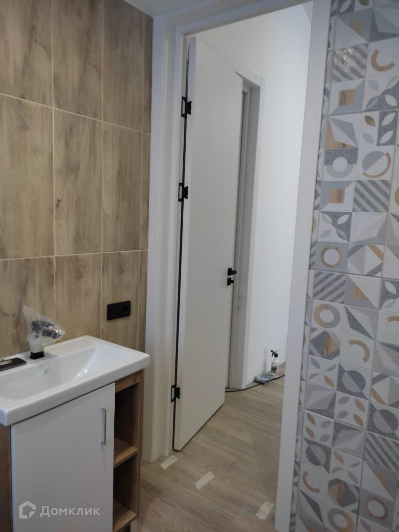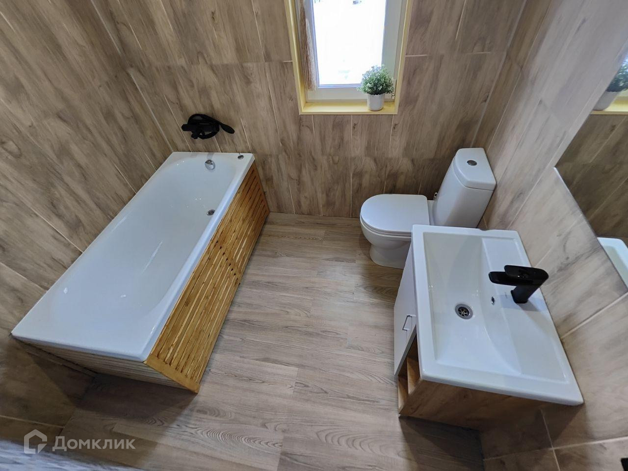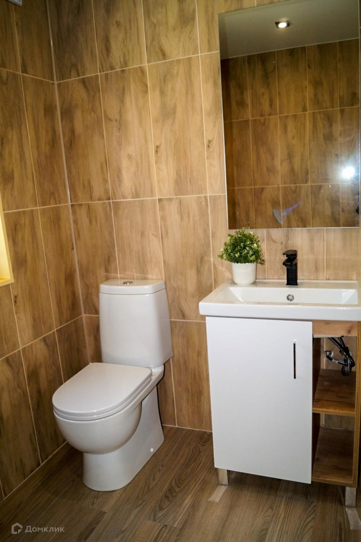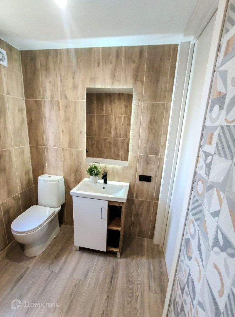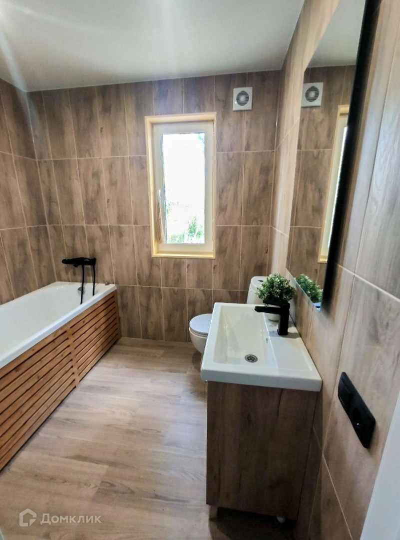 - В санузле на стенах керамическая плитка, установлена ванна, смесители, унитаз, раковина и система принудительной вентиляции;