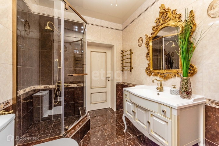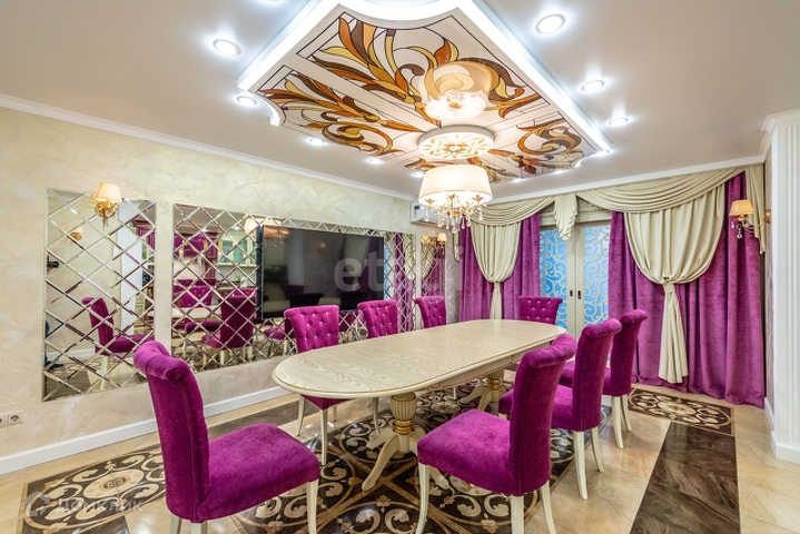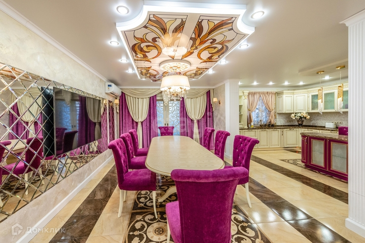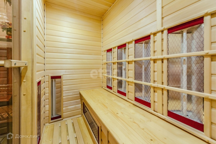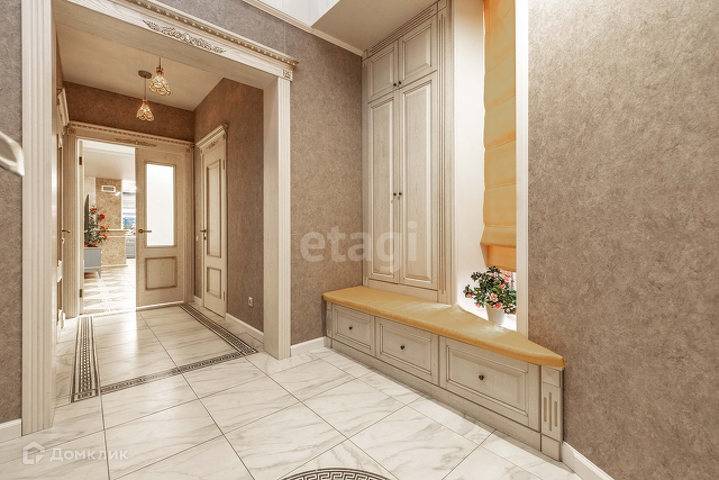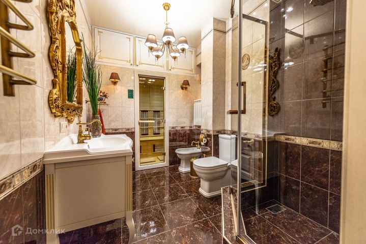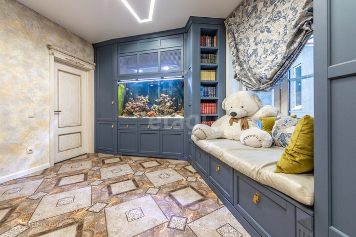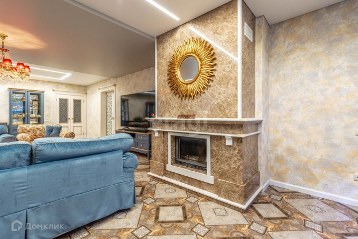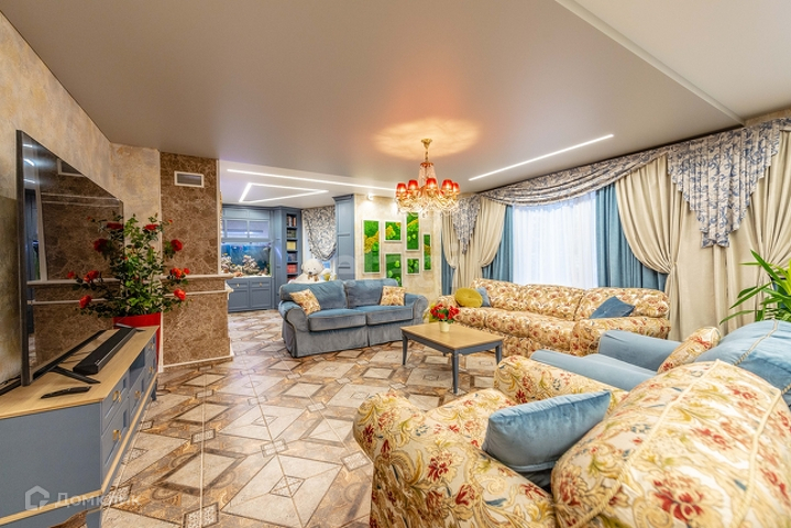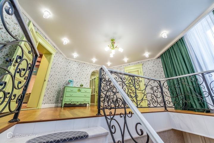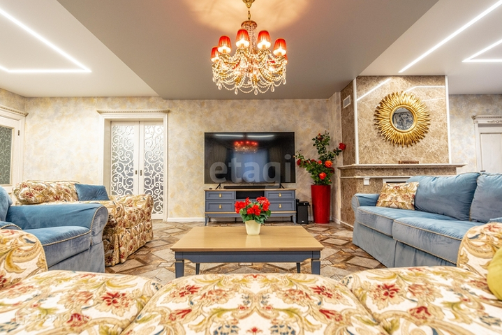 1 этаж: гостиная 55 м2 с морским аквариумом , мраморным камином, дизайнерской мебелью, гардеробная 14 м2, кухня(ясень+столешница натуральный камень) со столовой группой 40м2, спортзал, веранда с печью, санузел с инфракрасной сауной на 4 человек, прихожая со встроенной мебелью. Полы везде плитка с подогревом, кроме спортзала(прорезиноное покрытие)