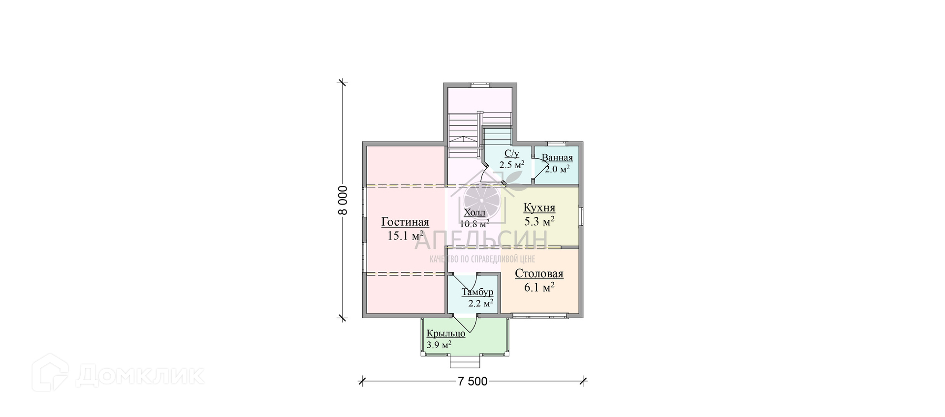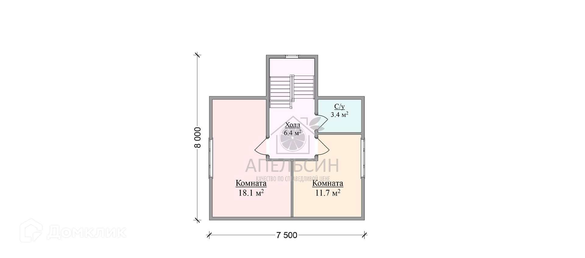 Размер дома 7,5х8 м, площадь коттеджа 112,5 м2, терраса, кол-во комнат — 2 спальни, кухня-гостиная, сантехнический узел на первом и втором этаже.