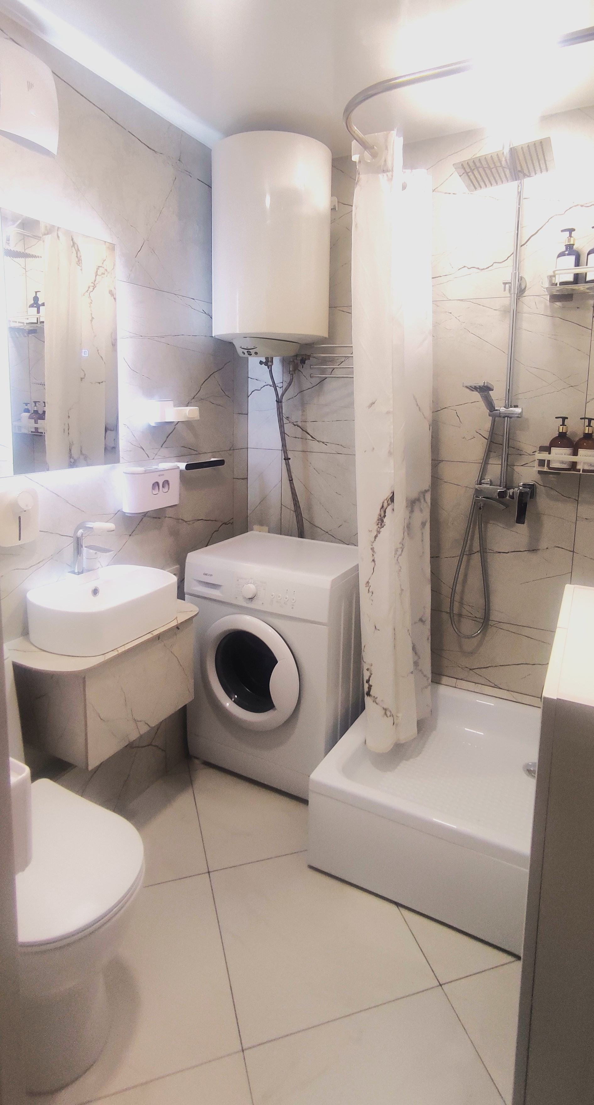 Стены в ванной комнате выложены широкоформатным керамогранитом 120*60, сделан тёплый пол.