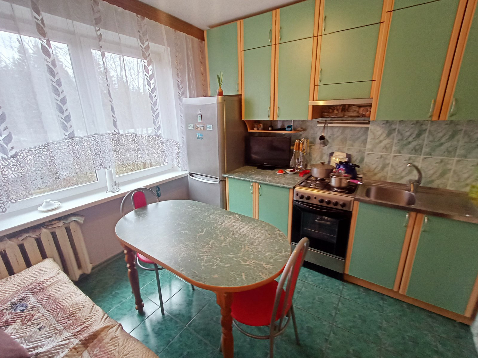 Встроенная кухня, холодильник, газовая плита, телевизор, стиральная машина.