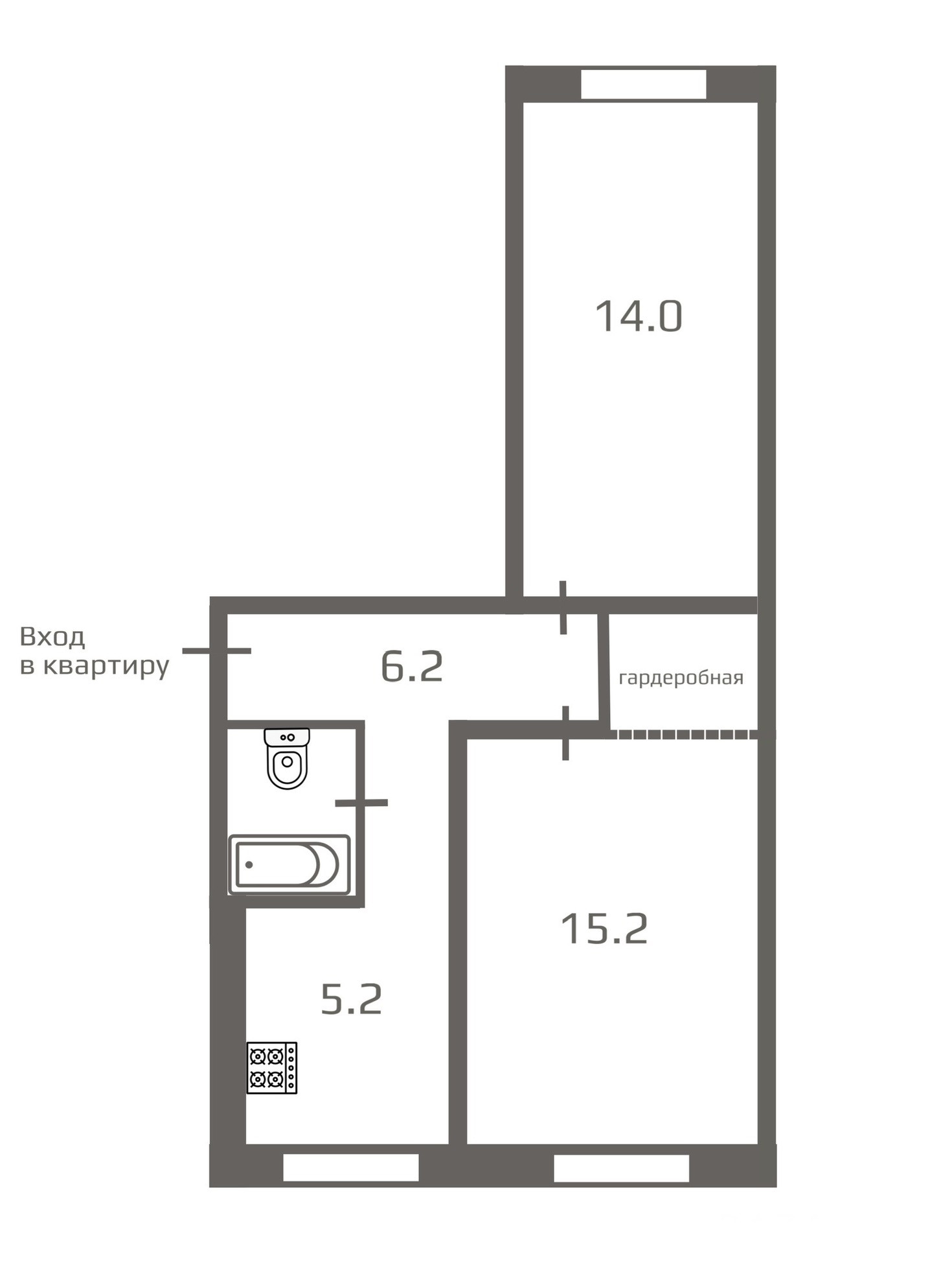Жилая площадь составляет 29.2 квадратных метров, комнаты изолированные 15.2 и 14.0 м2, в одной из комнат установлена гардеробная, что является удобным решением, нет необходимости в установке дополнительных шкафов, санузел совмещённый, отделан кафельной плиткой, кухня занимает 5.2 квадратных метров, на полу смонтирован керамогранит.